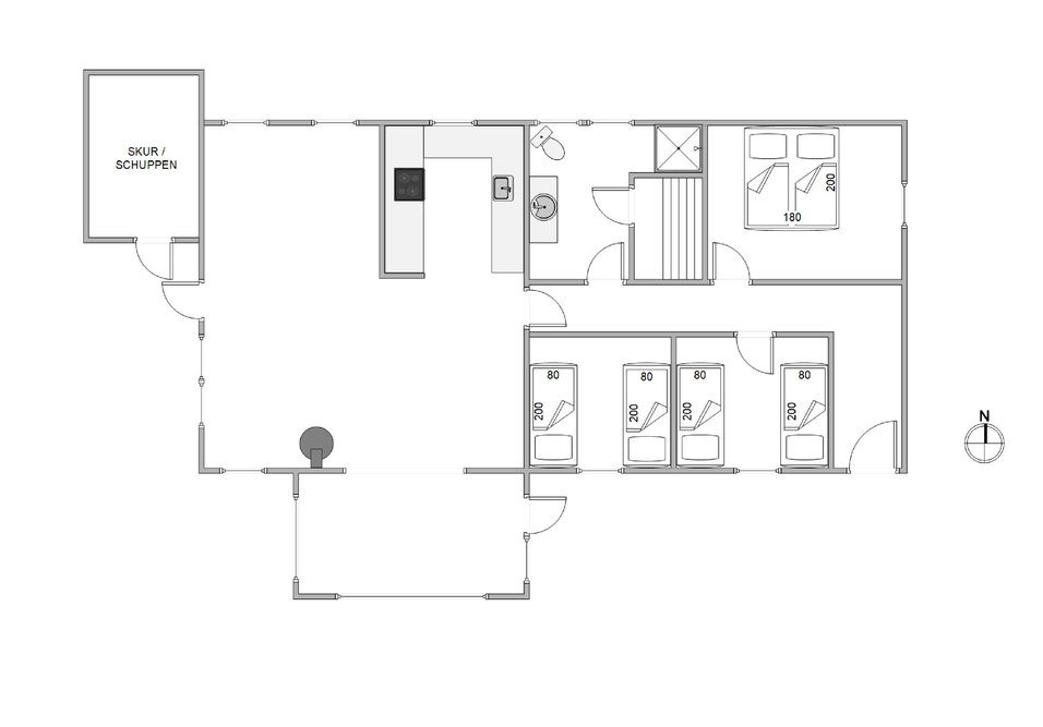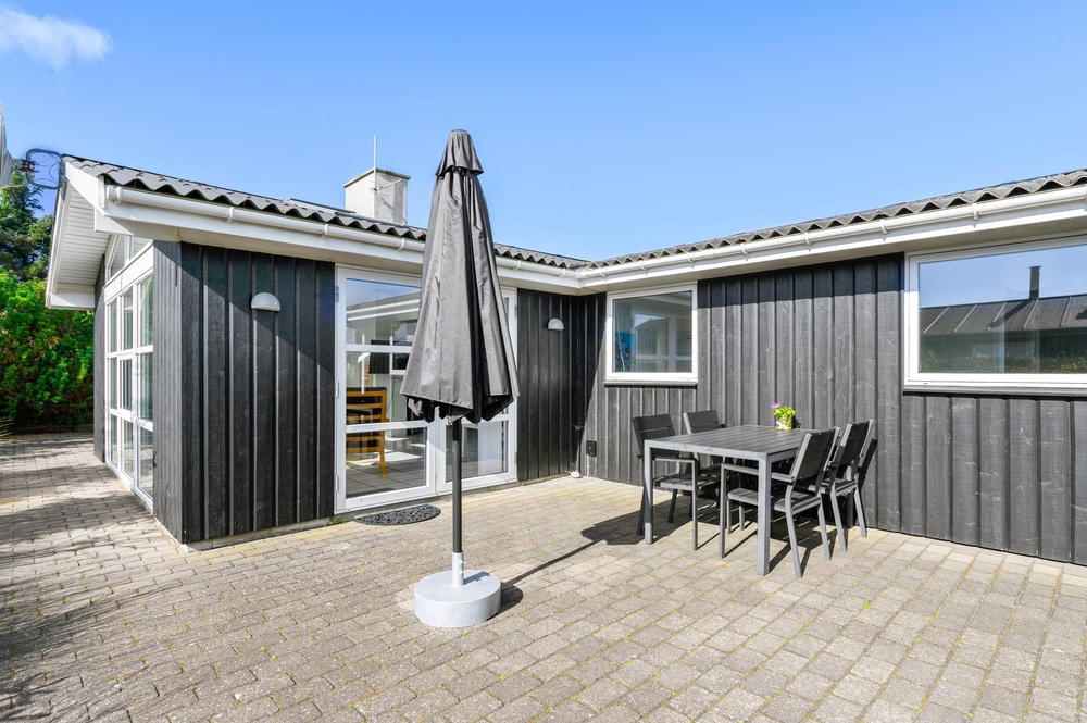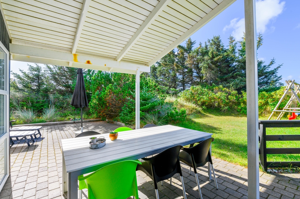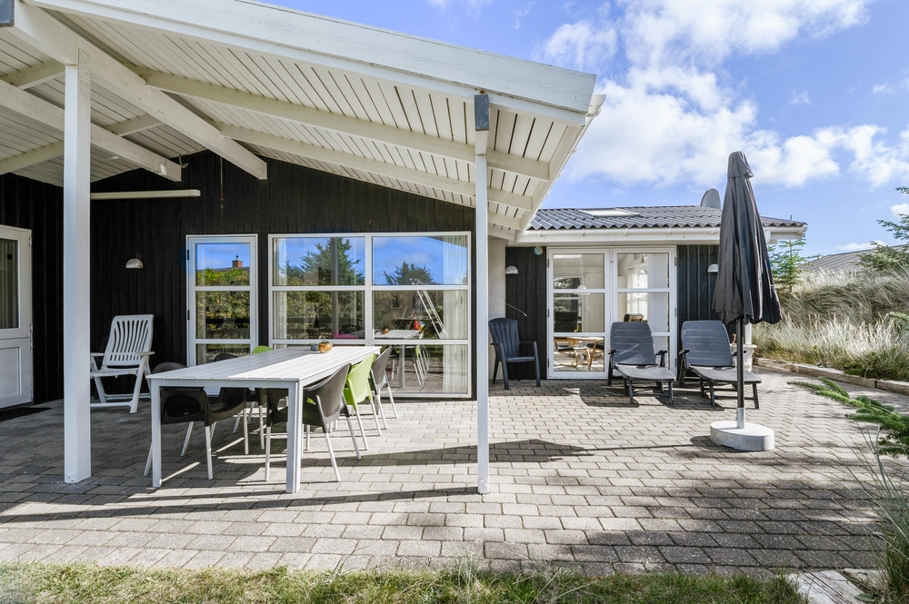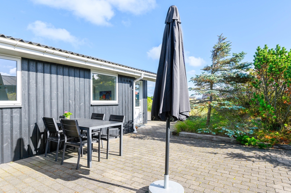 An der Süd- und Westseite des Ferienhauses verläuft eine offene Terrasse, die teilweise überdacht ist. Hier findet ihr ein gutes Plätzchen in der Sonne, um die warmen Strahlen zu genießen ? und wenn ihr lieber im Schatten sitzen möchtet, könnt ihr es euch unter dem überdachten Teil der Terrasse gemütlich machen. Liegestühle und Gartenmöbel sind vorhanden, sodass es euch an heißen Urlaubstagen an nichts fehlen wird.