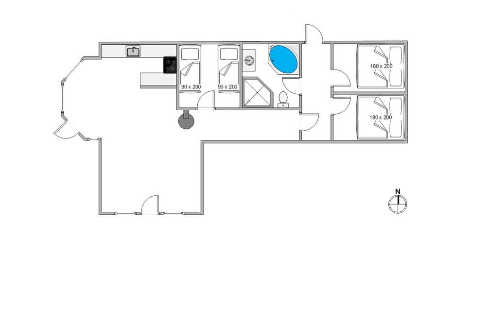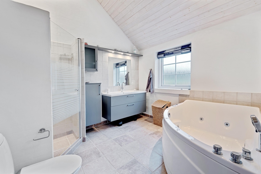 Im großen Badezimmer mit Bodenheizung findet ihr eins der Highlights des Ferienhauses: Hier steht der Whirlpool dazu bereit, euch mit schönen Wellnesserlebnissen zu verwöhnen. Die praktische Ausstattung des Hauses besteht u. a. aus einer Spülmaschine, einer Waschmaschine und einem Trockner.