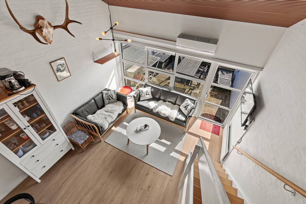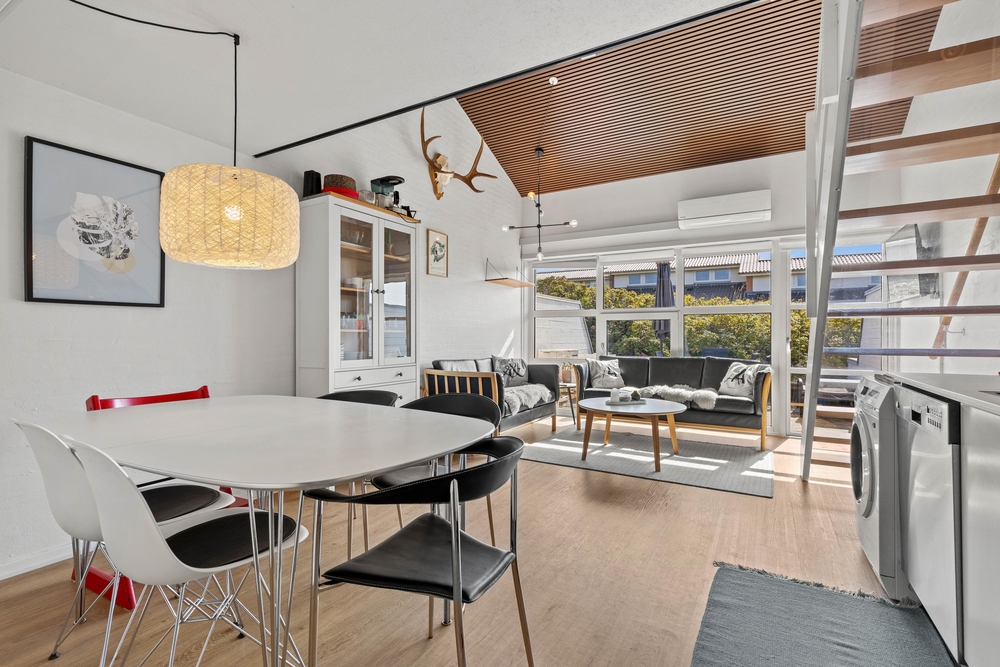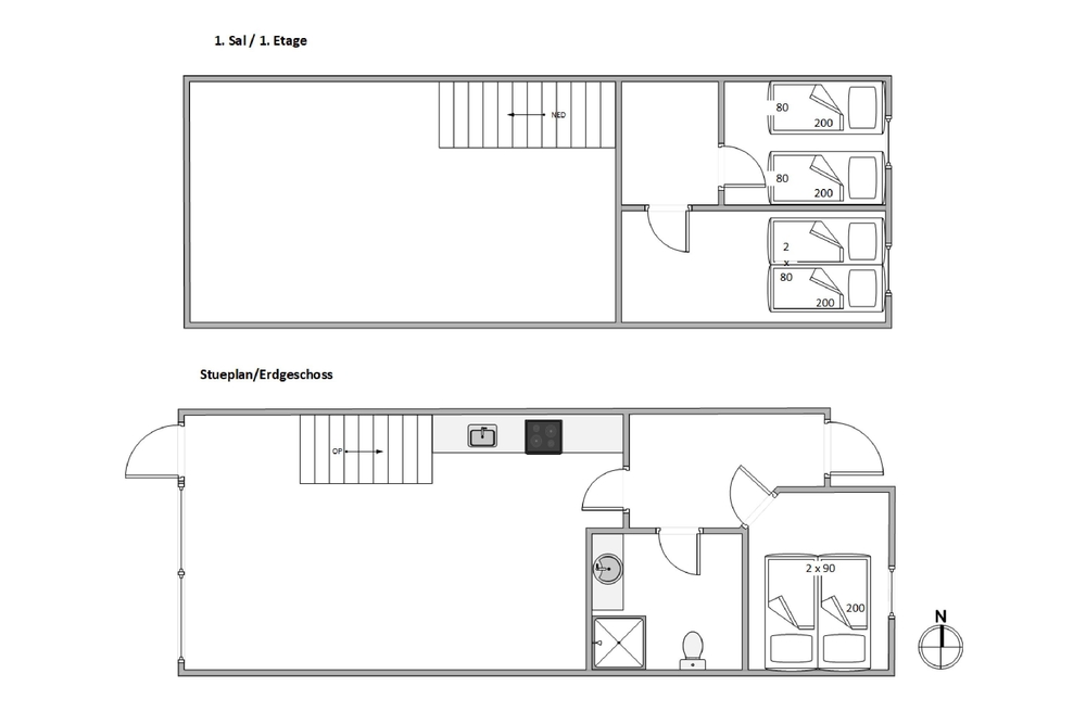 Die Ferienwohnung erstreckt sich über zwei Etagen, die mit einer Treppe miteinander verbunden sind. Oben gibt es 2 Schlafzimmer, von denen das eine mit 2 Einzelbetten, das andere mit einem Etagenbett ausgestattet ist. In der unteren Etage gibt es neben dem schönen offenen Wohnraum, ein modernes helles Badezimmer und ein Schlafzimmer mit Doppelbett.