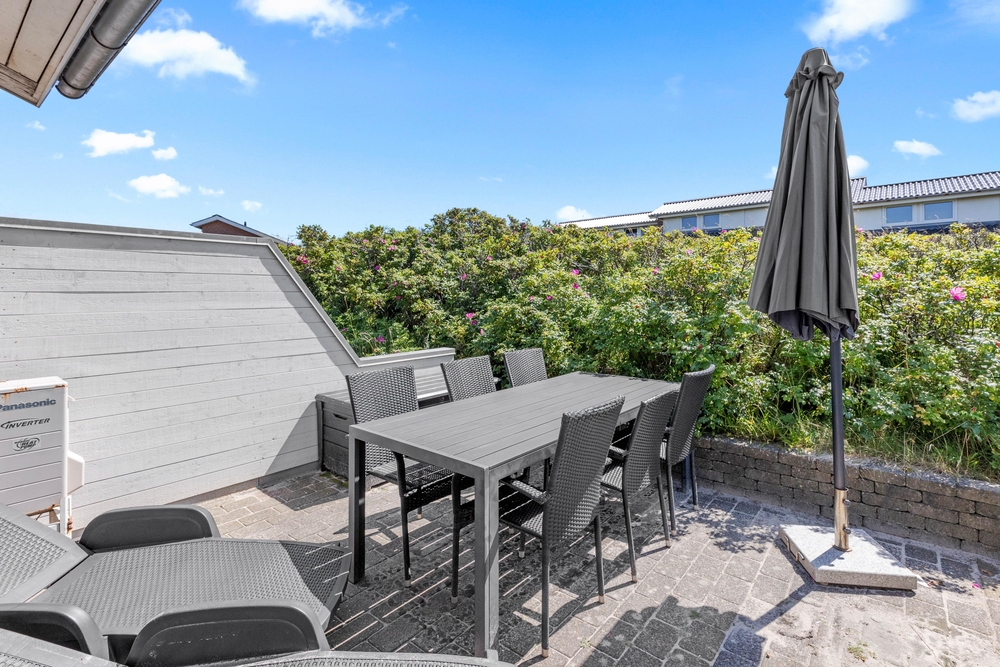 Vom Wohnraum aus habt Ihr direkten Zugang zur Südwestterrasse, auf der Ihr die Sonne geniessen und an der frischen Nordseeluft gemeinsame Mahlzeiten einnehmen könnt.