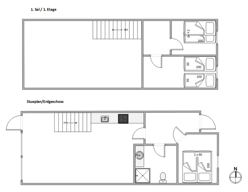 Die Ferienwohnung verfügt neben drei funktionalen Schlafzimmern im ersten Stock über einen kombinierten Wohn- Essbereich im Erdgeschoss, sowie ein Duschbad mit Fußbodenheizung. Die Räume sind hell und freundlich, durch große Fenster fällt viel Tageslicht herein.