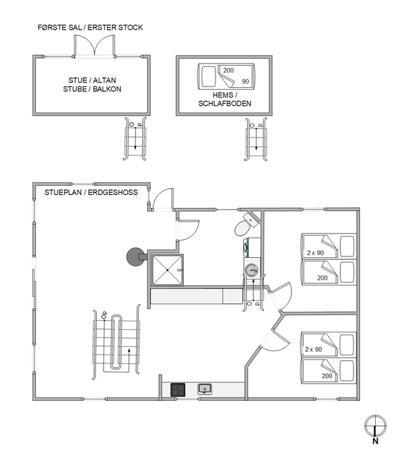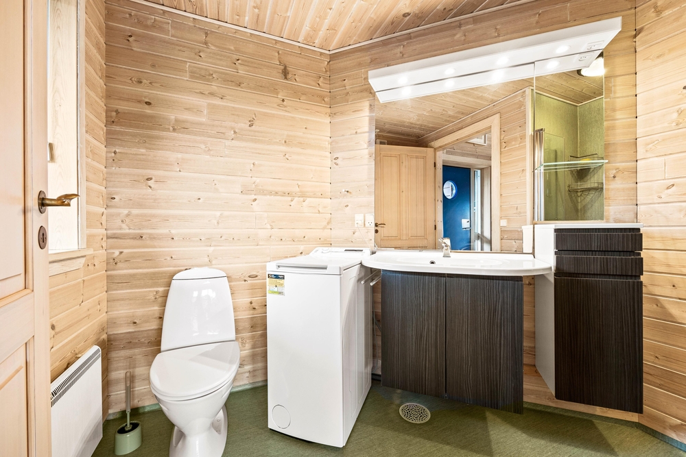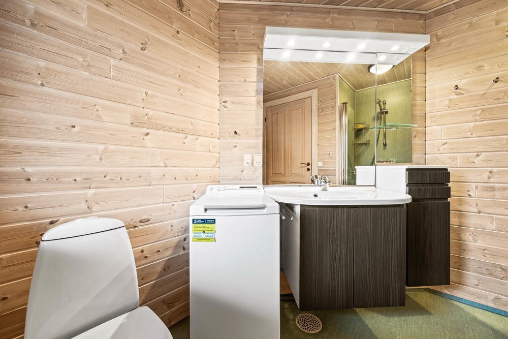 In der unteren Etage ist ein schönes, gepflegtes Badezimmer mit Waschmaschine, zwei geräumigen Schlafzimmer und ein gemütliches Wohnzimmer mit offener und funktioneller Küche. In dieser wird das Kochen zu einem Kinderspiel, vor allem weil die Geschirrspülmaschine den langweiligen Abwasch übernimmt. Macht es euch bequem auf der qualitativen Sofagarnitur, die direkt vor dem Kaminofen platziert wurde. Hier könnt ihr ein Spieleabend machen, einen guten Krimi lesen und den Gedanken freien lauf lassen. An kühleren tagen sorgt die Kosten und Energiesparende Wärmepumpe neben den Kaminofen für behagliche Temperaturen. Die Treppe im Wohnzimmer führt zum Schlafboden, indem ihr einen der 5 Schlafmöglichkeiten vorfindet und sogar eine zusätzliche kleine Stube mit dazugehörigem Balkon gibt es in der zweiten Etage zu entdecken.