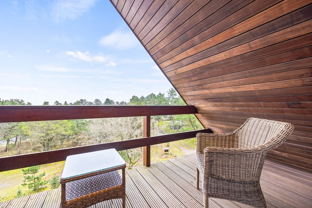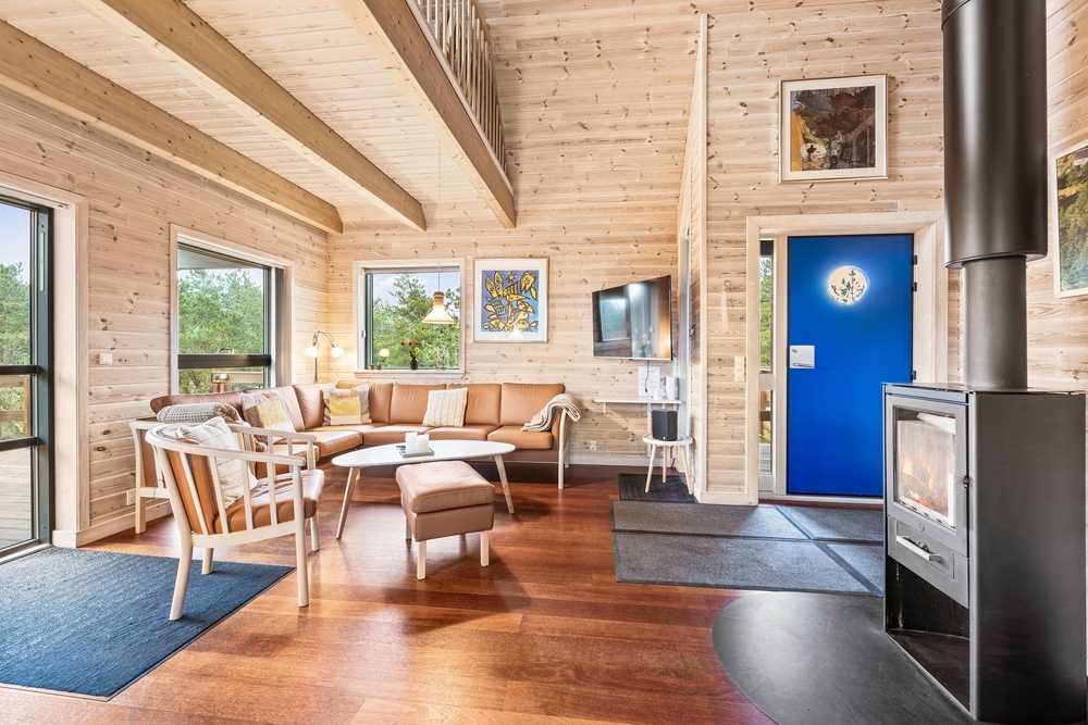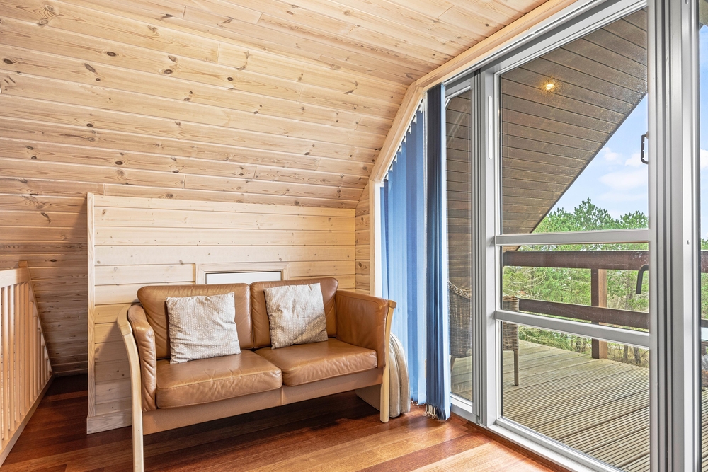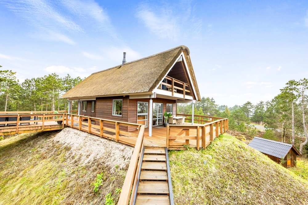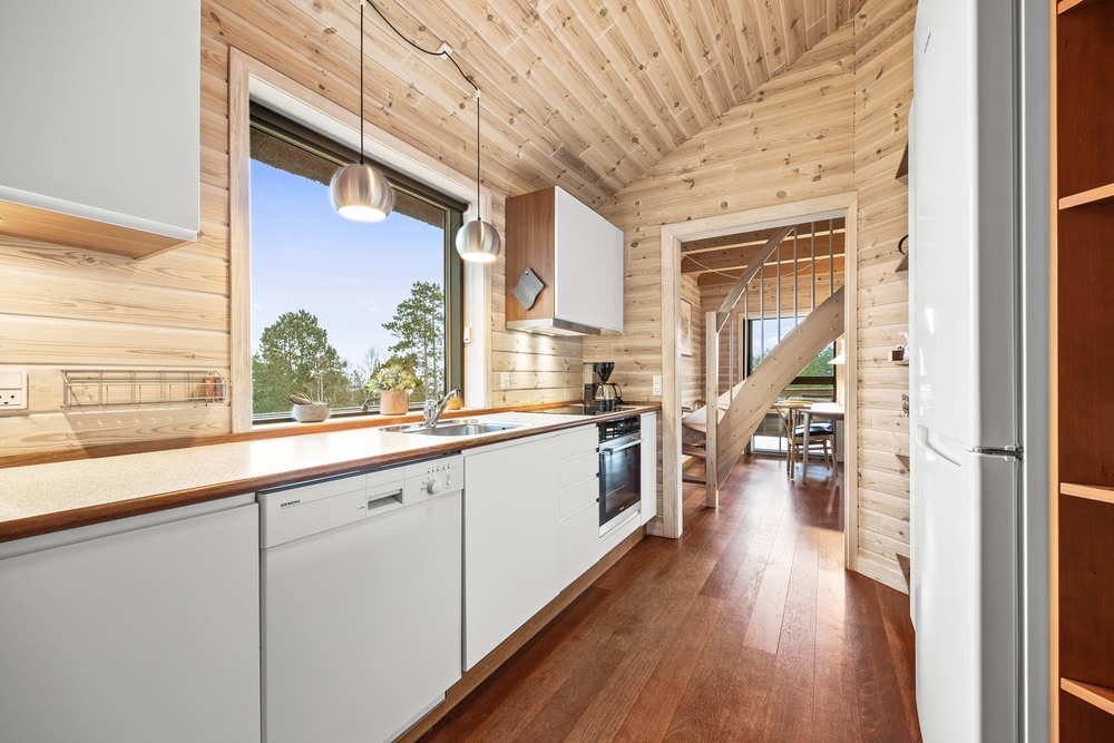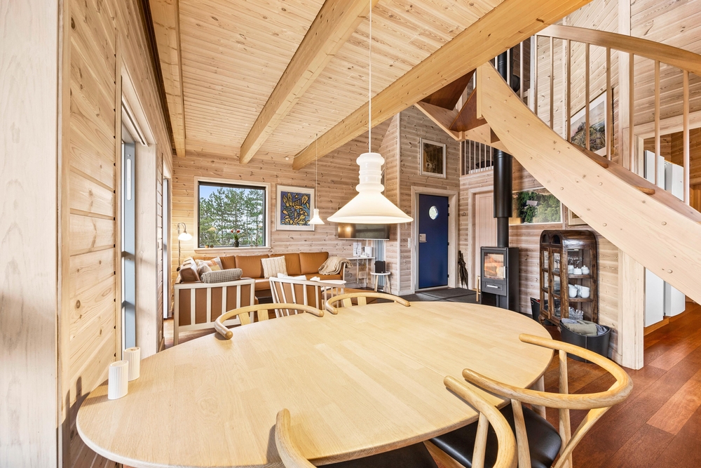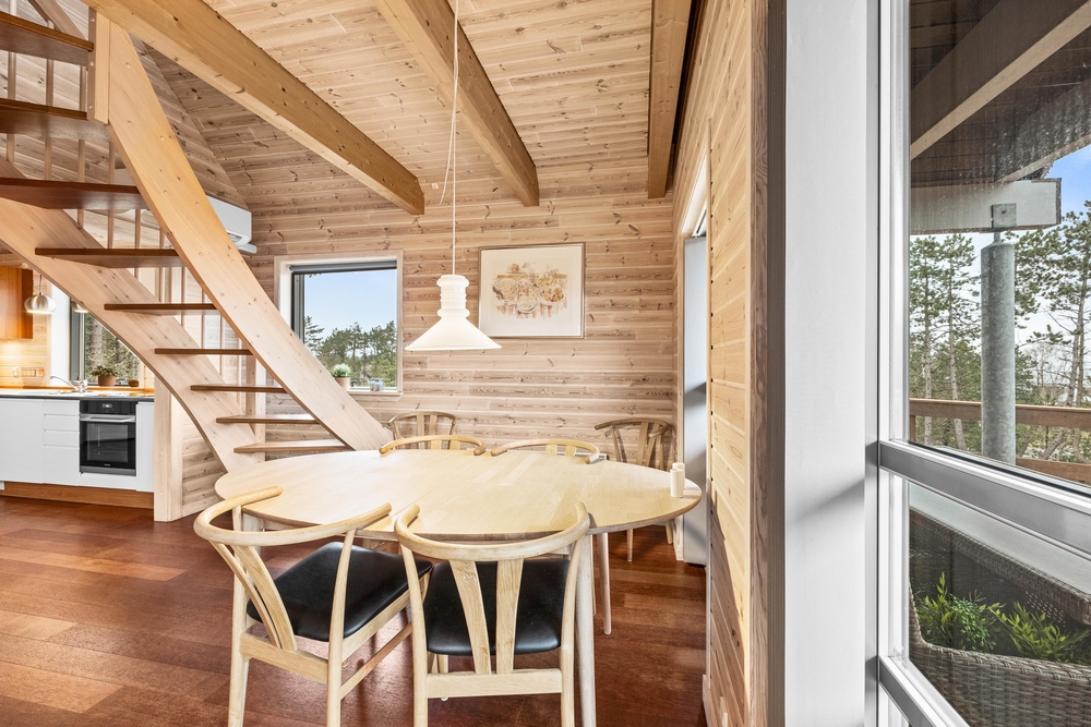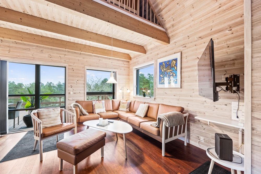 Sobald ihr das Auto geparkt habt, führt eine Treppe euch zum Ferienhaus, welches etwas oberhalb auf einen Hügel liegt. Von hier aus habt ihr eine sehr schöne Aussicht über die Naturumgebungen. Für das Ferienhaus wurden natürliche Materialen und hochwertiges Holz verwendet, welche sich auch im Innenbereich widerspiegeln und eine ruhige, angenehme Atmosphäre schaffen.