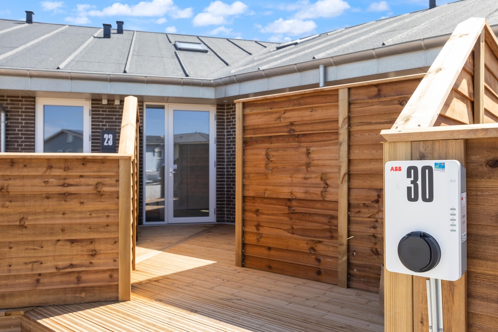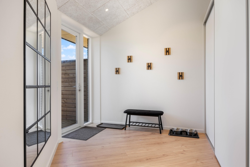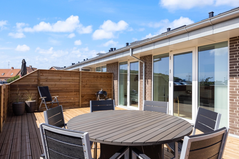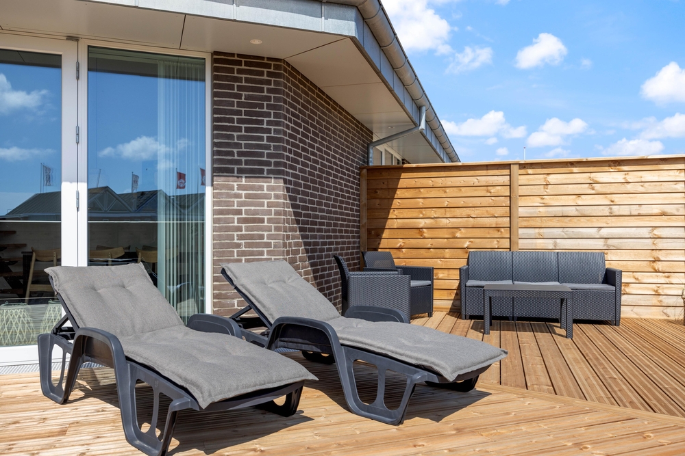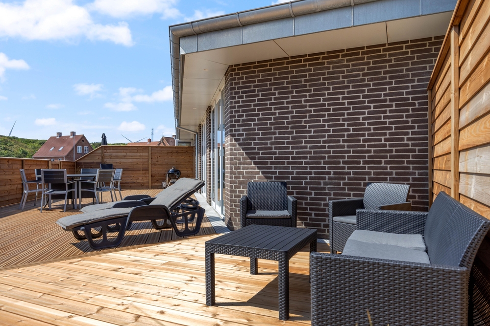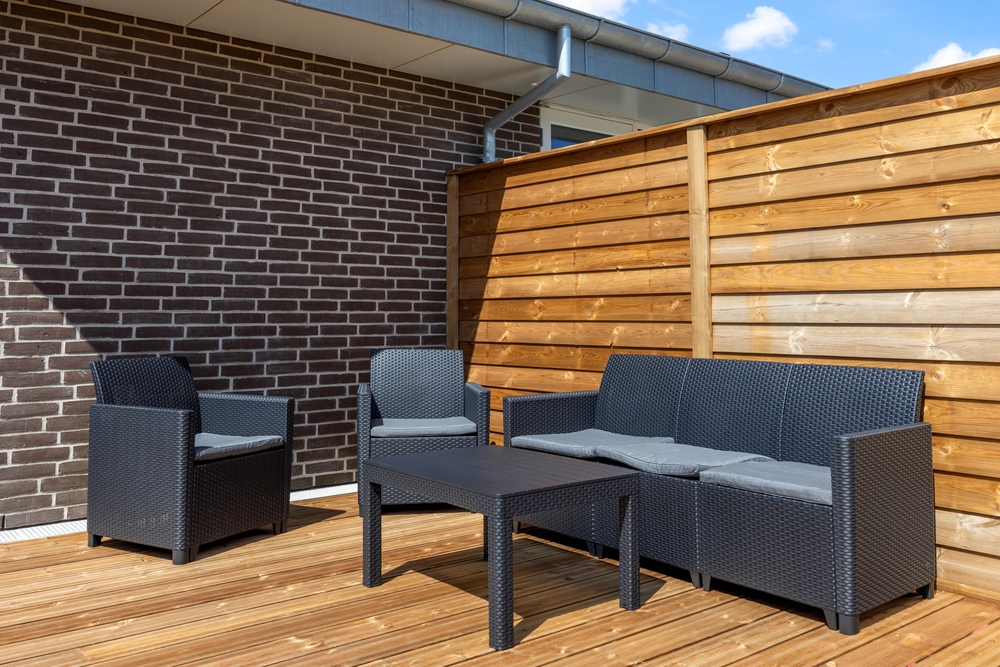 Auf der geschlossenen und abgeschirmten Terrasse, die nach Süden ausgerichtet ist und ihr Ausblick auf den Fjord habt, findet ihr bequeme Terrassenmöbel, die zum Entspannen einladen. Auch ein Grill darf für einen geselligen Grillabend natürlich nicht fehlen. Von hier aus könnt ihr das Geschehen in Hide Sande beobachten oder einfach die Sonne und die frische Luft genießen.