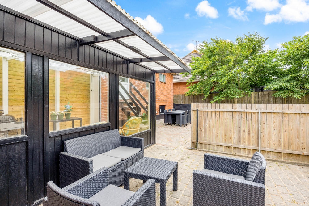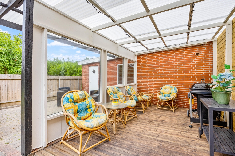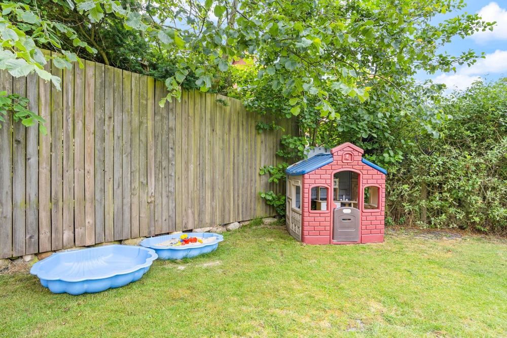 Euer gemütliches Ferienhaus bietet euch eine schöne, teilweise abgeschirmte und überdachte Terrasse, auf welcher ihr euch an den warmen Sommertagen entspannen könnt. Das eingezäunte Grundstück ist ideal für euren Hund, der sich hier austoben kann, während ihr auf der Terrasse ein Sonnenbad genießt.