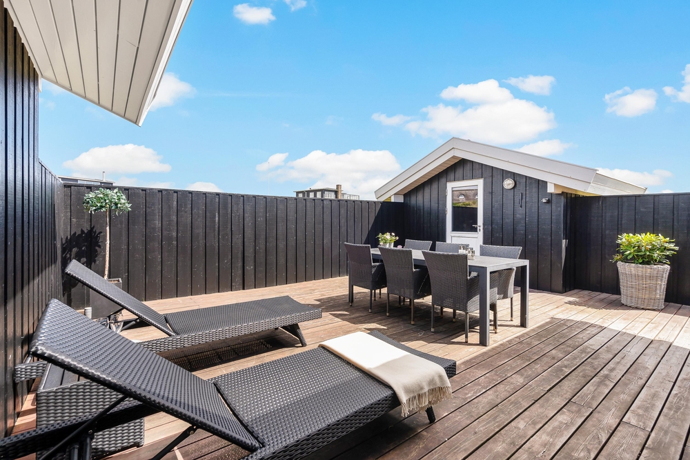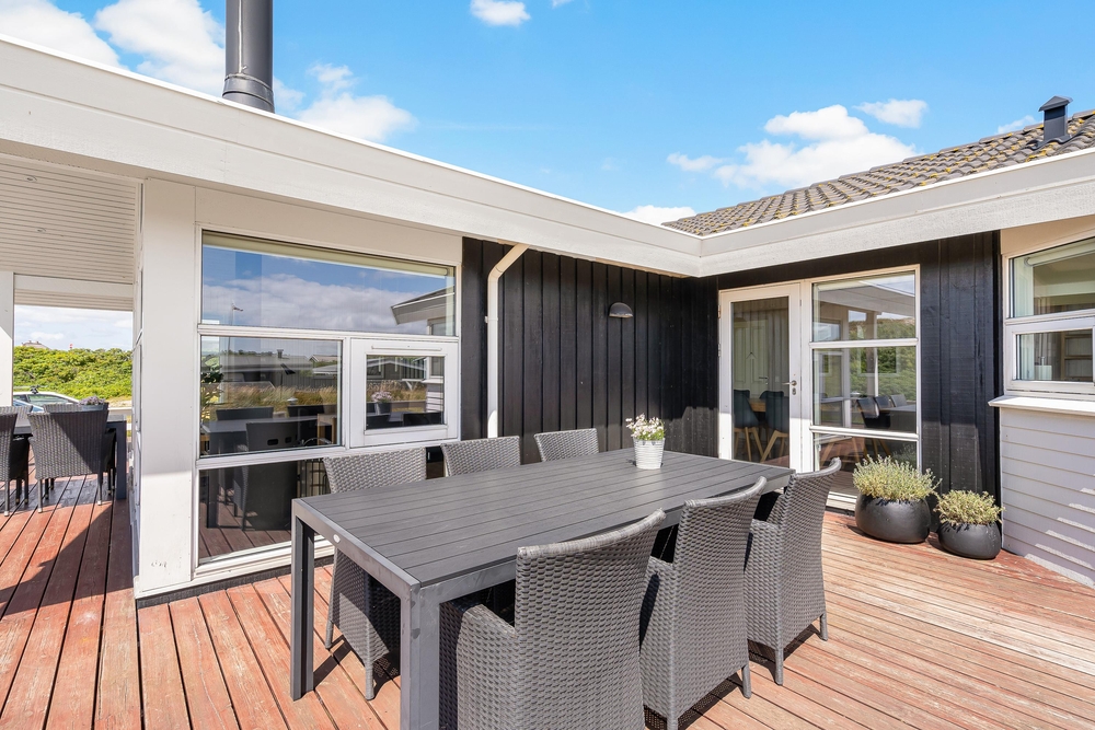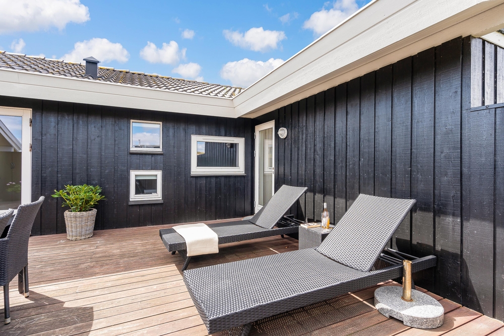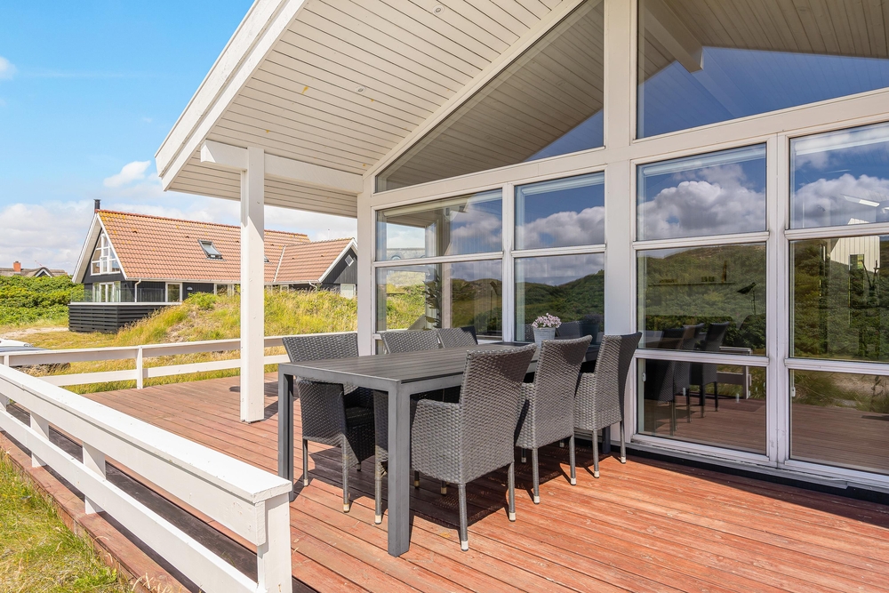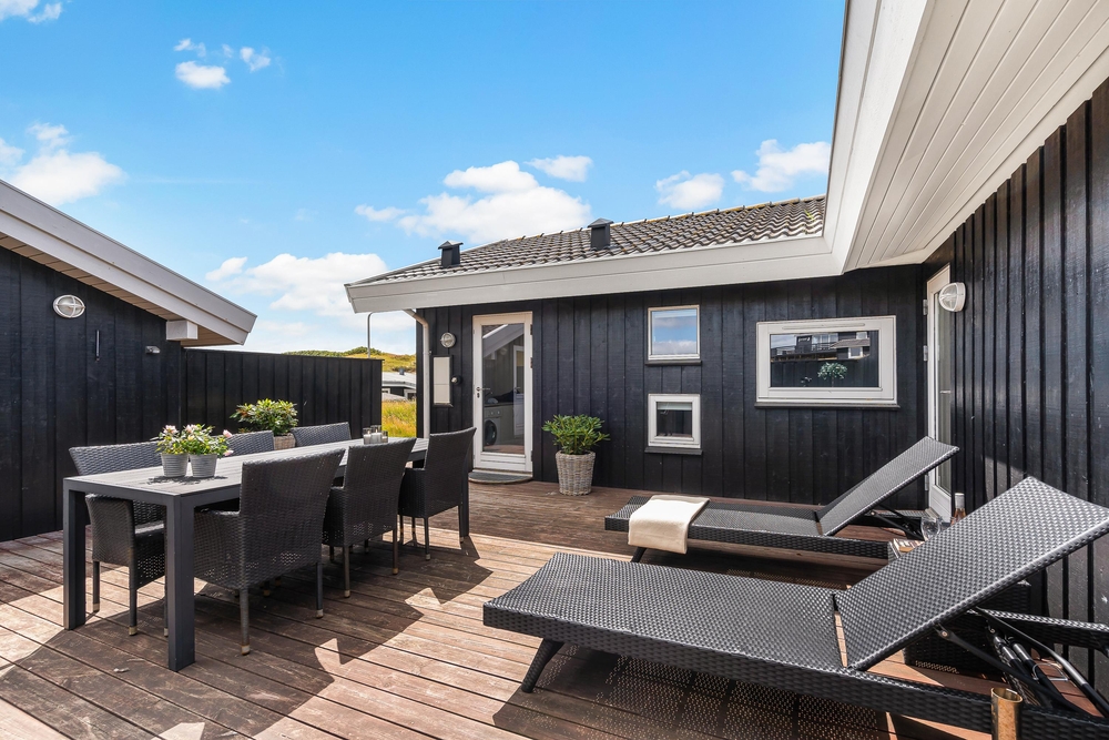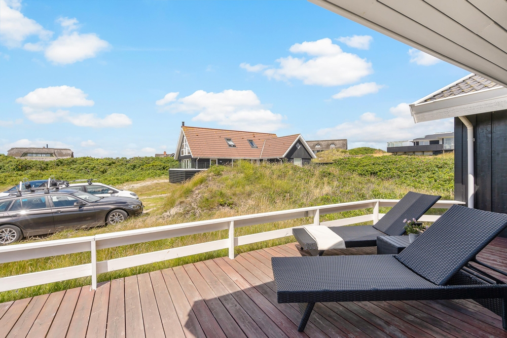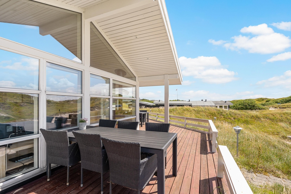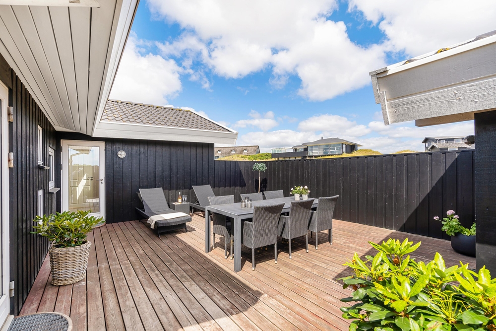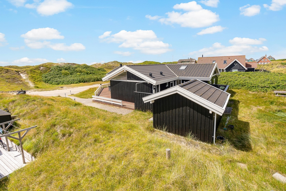 Von der an den Wohnbereich angrenzenden und nach Westen ausgerichteten Terrasse bietet sich euch ein traumhafter Ausblick! Eine hügelige Dünenlandschaft mit dem sich im Wind wiegenden Dünengras, blauer Himmel, so weit das Auge reicht, und ab und an schaut vielleicht auch einmal ein Hase oder ein Reh vorbei. Die Vögel zwitschern hoch am Himmel, und während ihr euch auf der Sonnenliege ausruht, können sich eure Kinder in der unmittelbaren Umgebung austoben oder auf der Schaukel und im Sandkasten spielen. Der Außenwhirlpool bietet Entspannungsmomente an der frischen Meeresluft, und für eine Erfrischung steht euch von April bis November eine Außendusche zur verfügung.