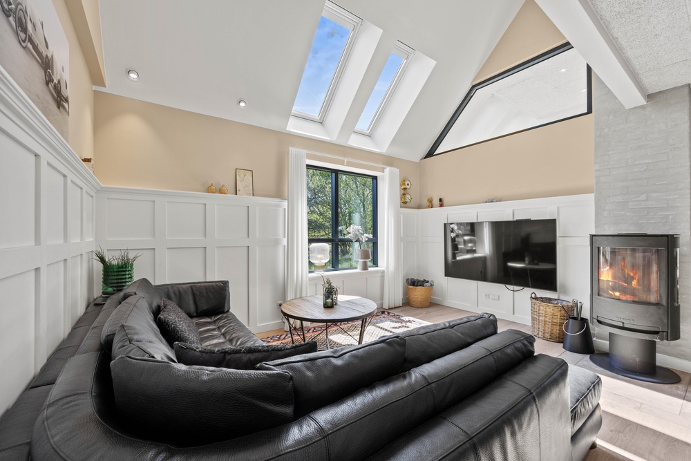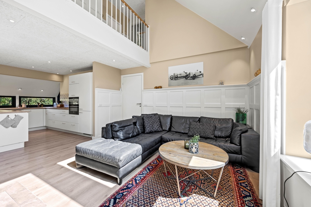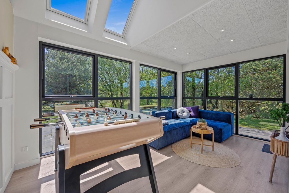 Der großzügige Wohnbereich im Erdgeschoss ist mit einem bequemen Sofa, einem Fernseher und einem Kaminofen ausgestattet, um gemütliche Abende zu garantieren. Die Dachfenster und die offene Galerie sorgen für eine helle und freundliche Atmosphäre. Eine effiziente Wärmepumpe bietet zusätzliche Wärme und Komfort. Im Wintergarten erwartet euch eine zweite gemütliche Sofalandschaft und einem Tischkicker, ideal für gesellige Stunden. So könnt ihr euch gut aufteilen ? während die Einen vorm Kamin entspannen oder fernsehen, können die Anderen sich bei einem Spielabend austoben.