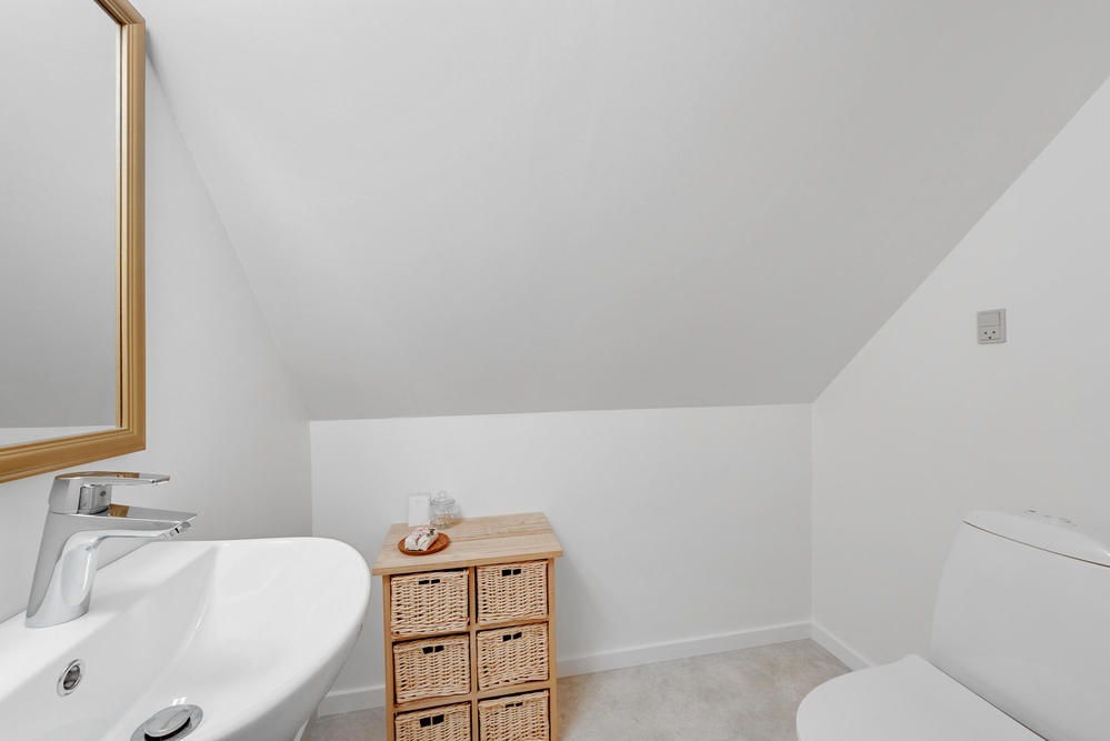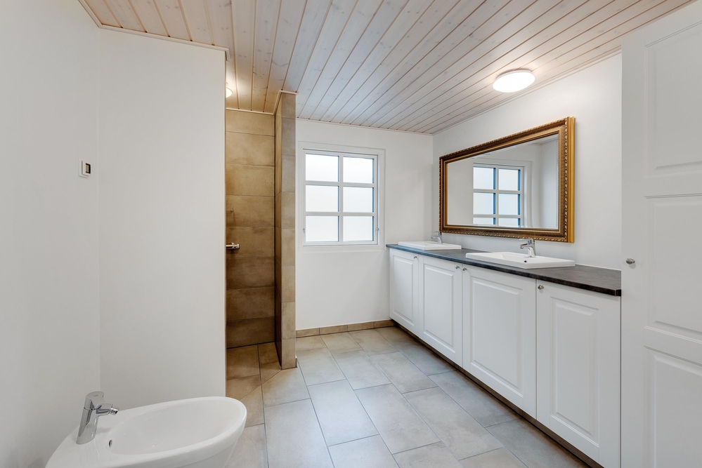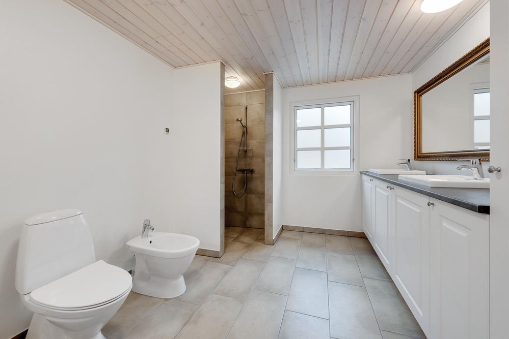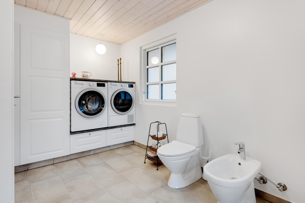 Zwei der insgesamt drei Schlafzimmer befinden sich wie auch das Gäste-WC im Obergeschoss des Hauses. Das Hauptbadezimmer, ist mit einem Duschbad, WC und auch Waschmaschine sowie Trockner ausgestattet und befindet sich im Erdgeschoss des Hauses. Es verfügt zudem auch über ein Doppelwaschbecken und eine Fußbodenheizung, was besonders an kühleren Tagen sehr angenehm ist.