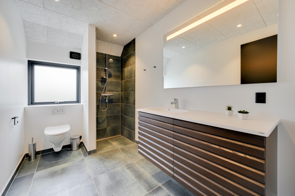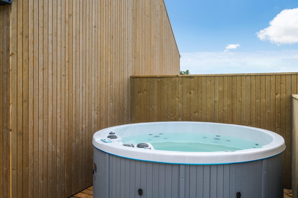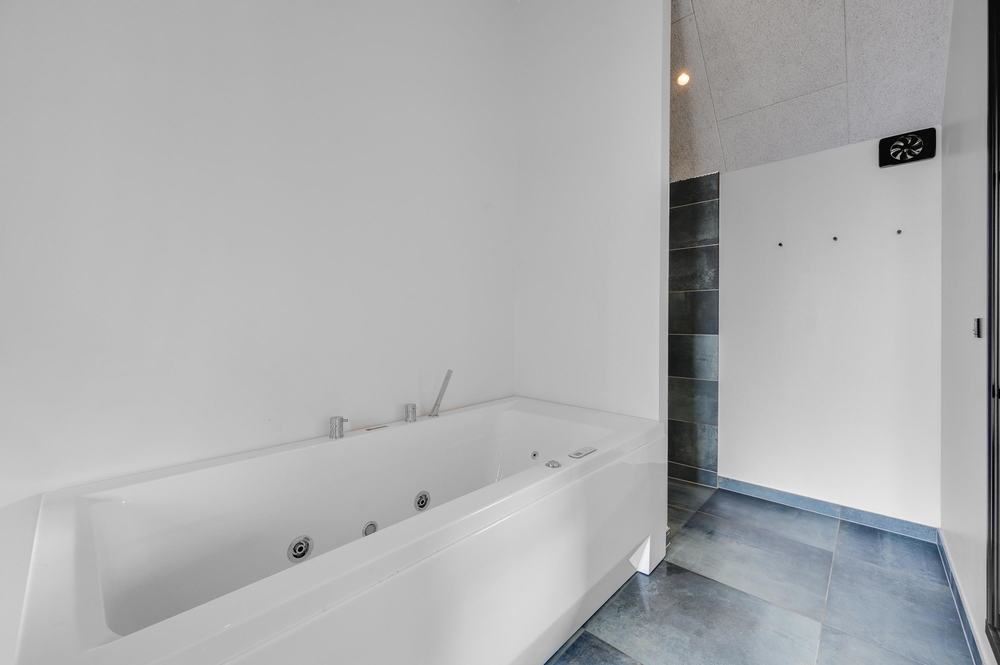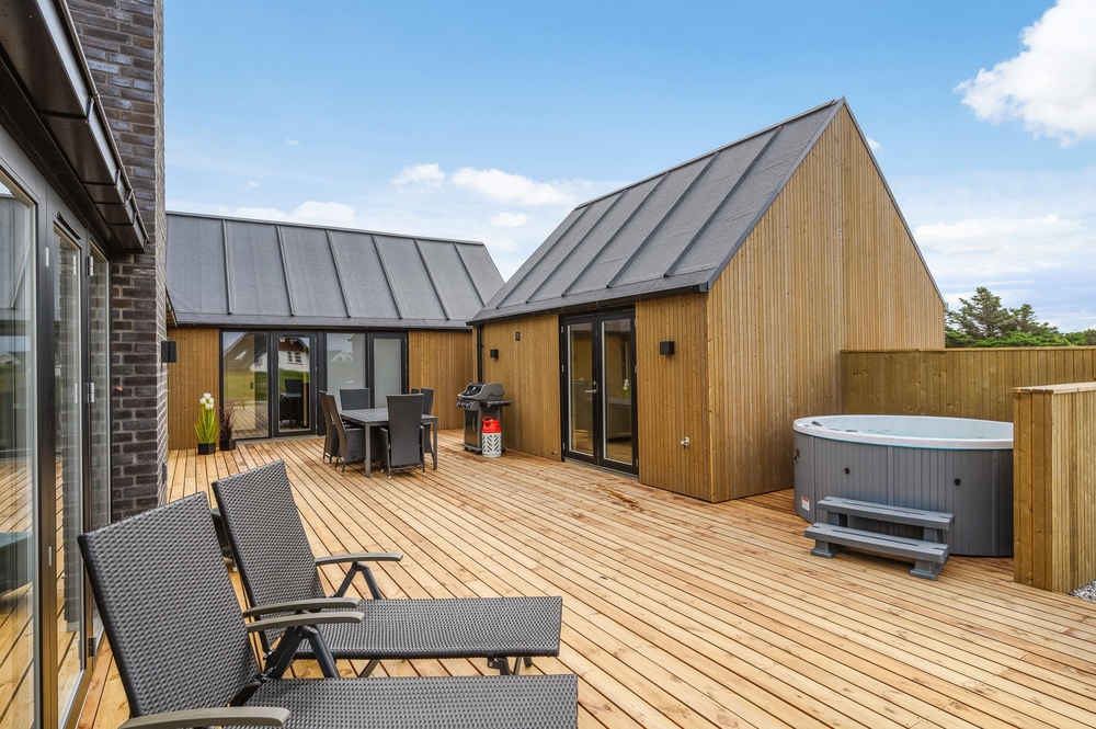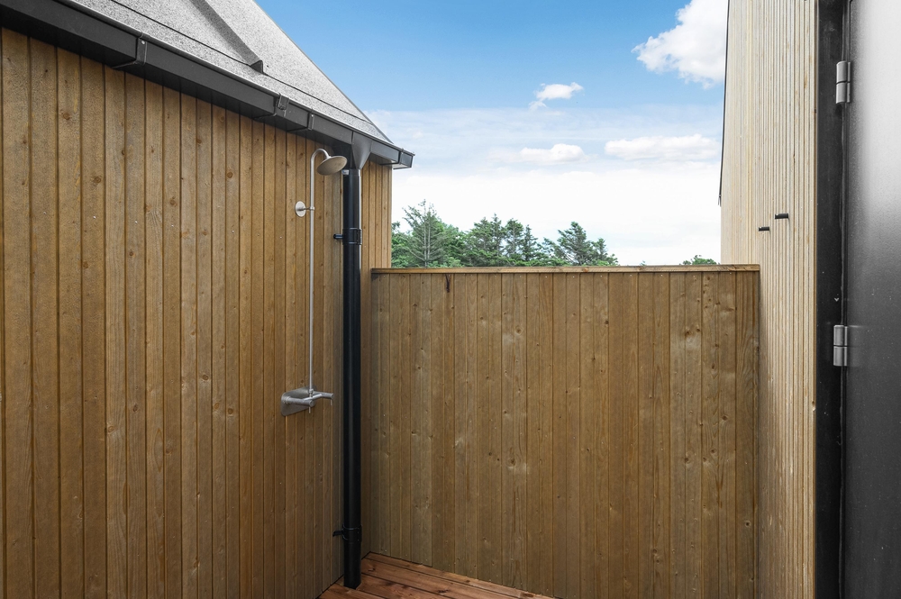 Auf Qualität und Luxus wurde hier nicht verzichtet. Auf der großen Holzterrasse hält das Haus einen besonderen Leckerbissen bereit, hier findet ihr einen Außenwhirlpool und eine Außendusche. Sogar an eine Aufladestation für ein Elektroauto wurde hier gedacht.