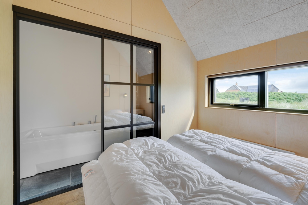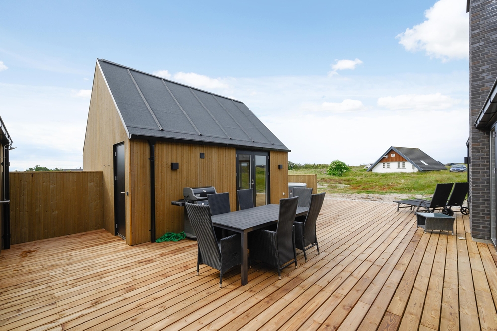 Die Holzterrasse ist das Herzstück des Außenbereichs. Hier gibt es jede Menge Möglichkeiten den Tag am Haus zu verbringen. Gut ausgestattet mit Gartenmöbeln könnt ihr den Tag mit einem gemeinsamen Frühstück auf der abgeschirmten Terrasse beginnen und am Abend bei einem leckeren Essen vom Grill beenden. An besonders warmen Tagen könnt ihr euch unter der Außendusche erfrischen oder nach einem Spaziergang am Strand den Sand von den Füßen spülen. Die Außendusche kann von April bis November genutzt werden. Später am Abend könnt ihr im Außenwhirlpool, mit einem Glas Wein in der Hand, der Sonne zuschauen, wie sie langsam hinter den Dünen untergeht.