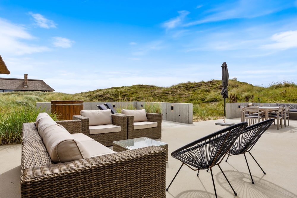 Das Ferienhaus verfügt über mehrere offene, abgeschirmte und überdachte Terrassen, sodass ihr jederzeit einen sonnigen und windgeschützten Platz finden könnt. Mit einem kalten Getränk oder einer heißen Tasse Kaffee in der Hand kann man die umliegende Natur wunderbar und ungestört genießen. Mit nur 450 Metern zur tosenden und rauen Nordsee bietet es sich geradezu an, an heißen Sommertagen ein erfrischendes Bad im Meer nehmen.