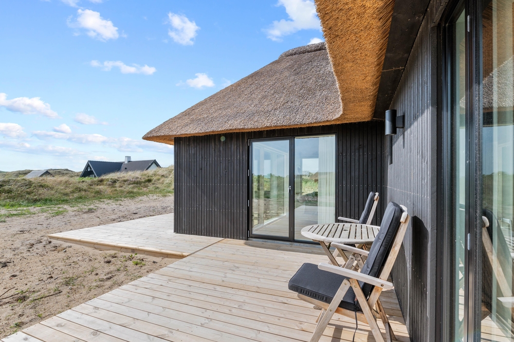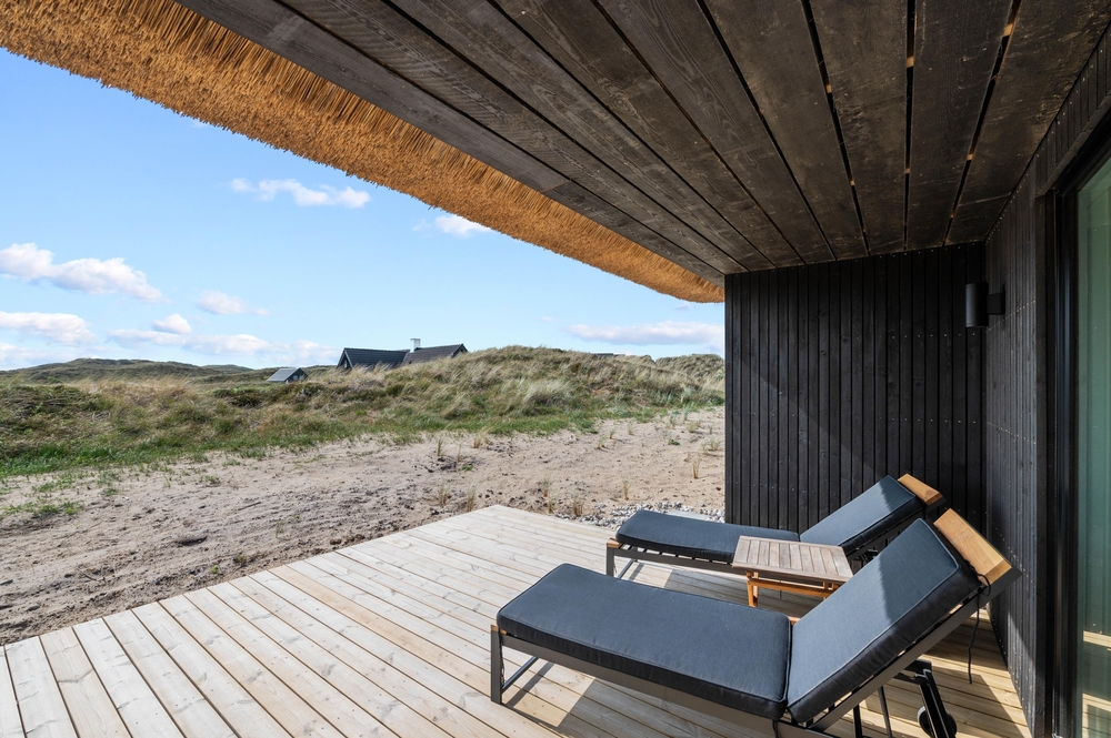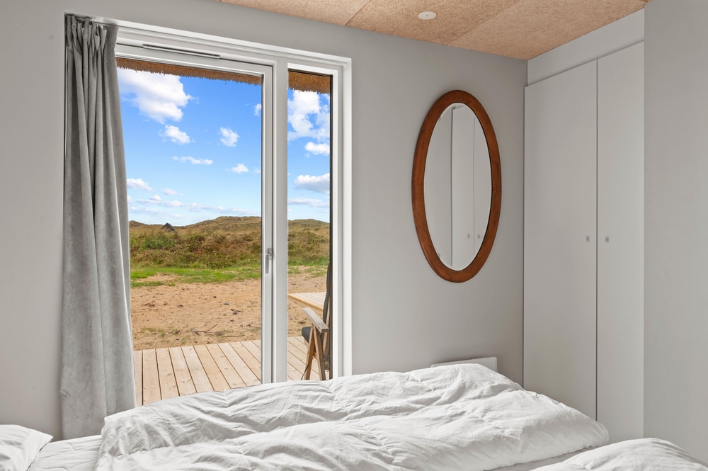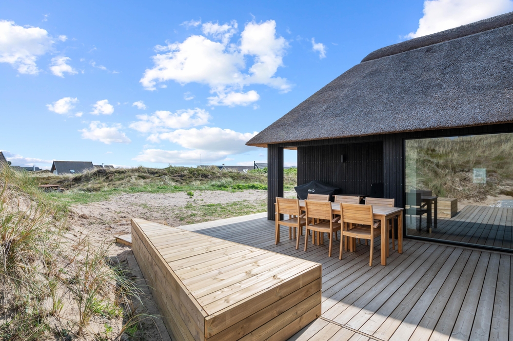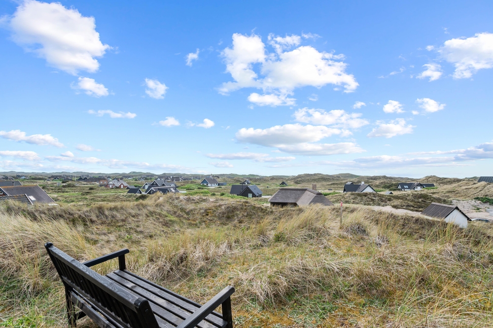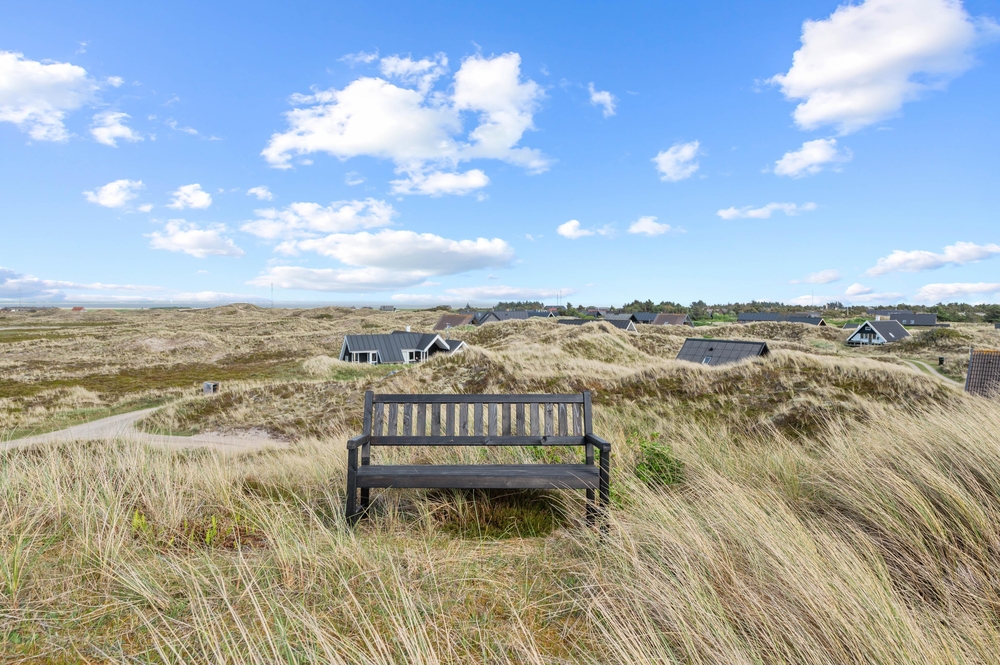 Das Ferienhaus im Opstrupsvej 80 liegt mitten in der Dünenlandschaft, nur 450 Meter vom Meer entfernt, umgeben von Terrassen, von denen aus ihr die jütländische Natur genießen könnt. Hier könnt ihr sitzen und die schöne Landschaft bei einer guten Tasse Kaffee oder einem kühlen Getränk genießen. Außerdem findet ihr auf einer kleinen Düne eine Bank, von der aus ihr einen wunderbaren Blick auf den Ringkøbing Fjord und die Nordsee habt. Von hier aus könnt ihr einen romantischen Sonnenuntergang genießen.