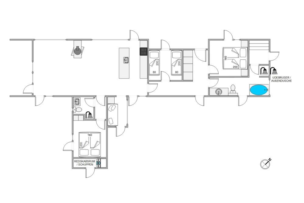 Euer Treffpunkt im Urlaub wird ohne Zweifel der große und helle Wohnraum, in dem Küche mit Spülmaschine, Esszimmer und Wohnzimmer vereint sind. Das Haus hat durch die schönen, großen Fenster einen tollen Lichteinfall, und die offenen Räume ermöglichen es jedem, den Koch- oder Urlaubsplänen zu folgen. Es gibt 2 Badezimmer im Haus, sodass es bei der Morgenroutine keine Warteschlangen gibt.