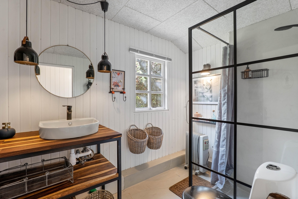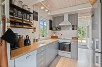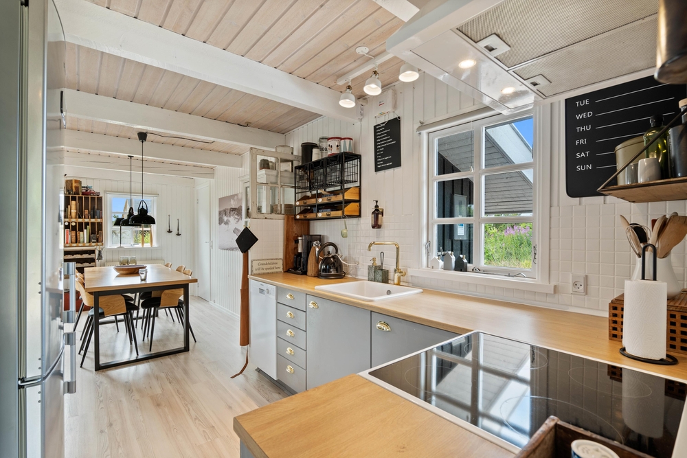 Das zuletzt in 2022 liebevoll renovierte Sommerhaus ist hell und mit vielen schönen Details sowie einer geschmackvollen Möblierung ausgestattet. Die kombinierte Wohnküche bietet einen schönen Lichteinfall mit ihren großen Fenstern nach Süden. Sowohl vom Esstisch und als auch vom Sofa habt ihr Blick auf den knisternden Kamin und die wunderschöne Natur, die das Haus umgibt.