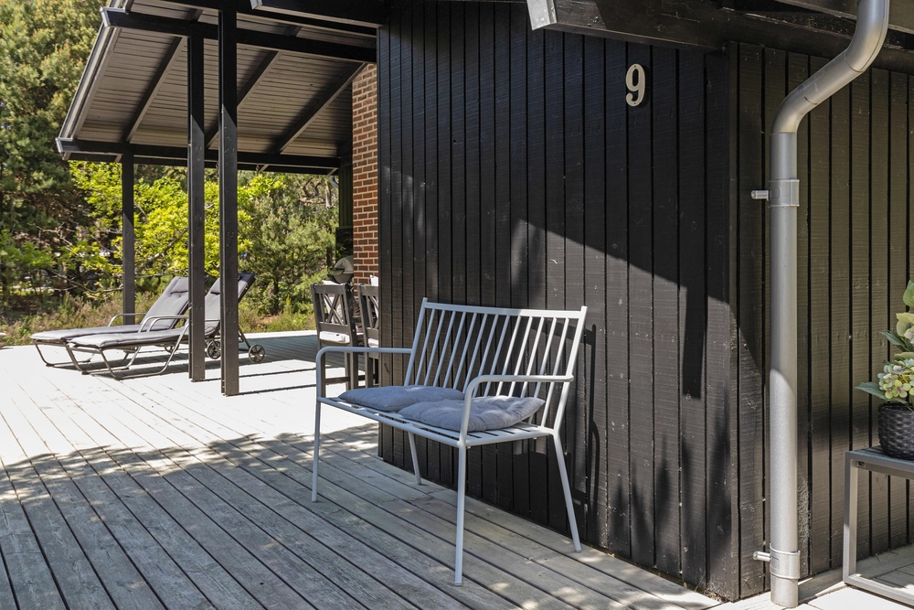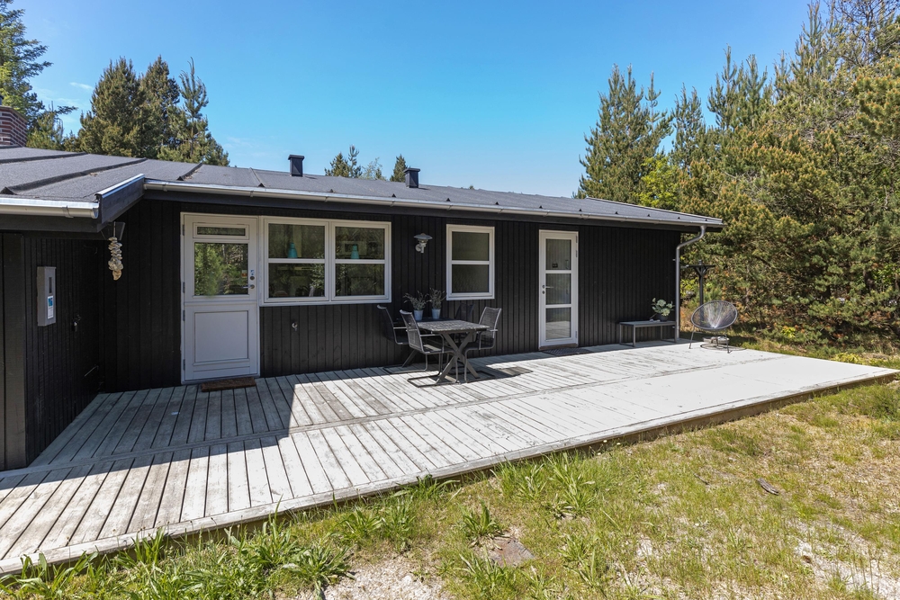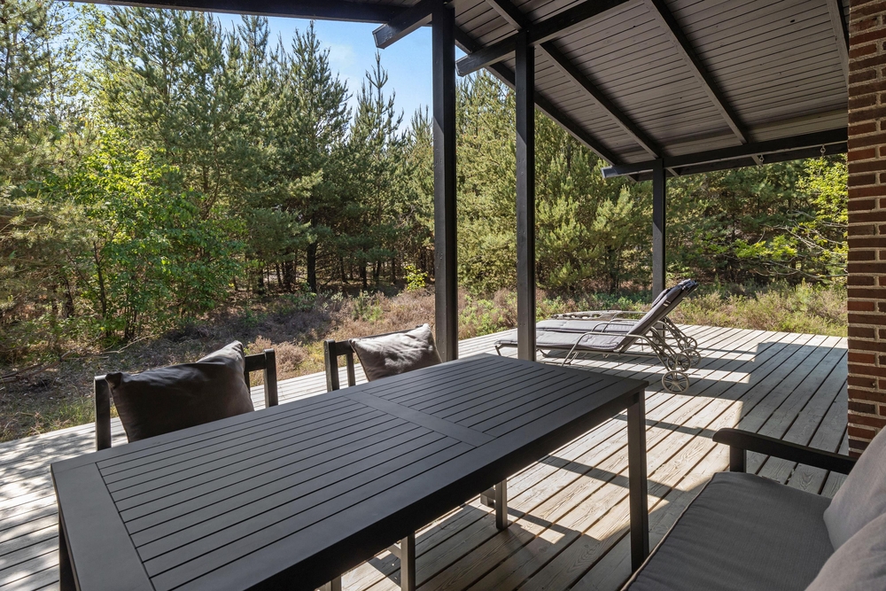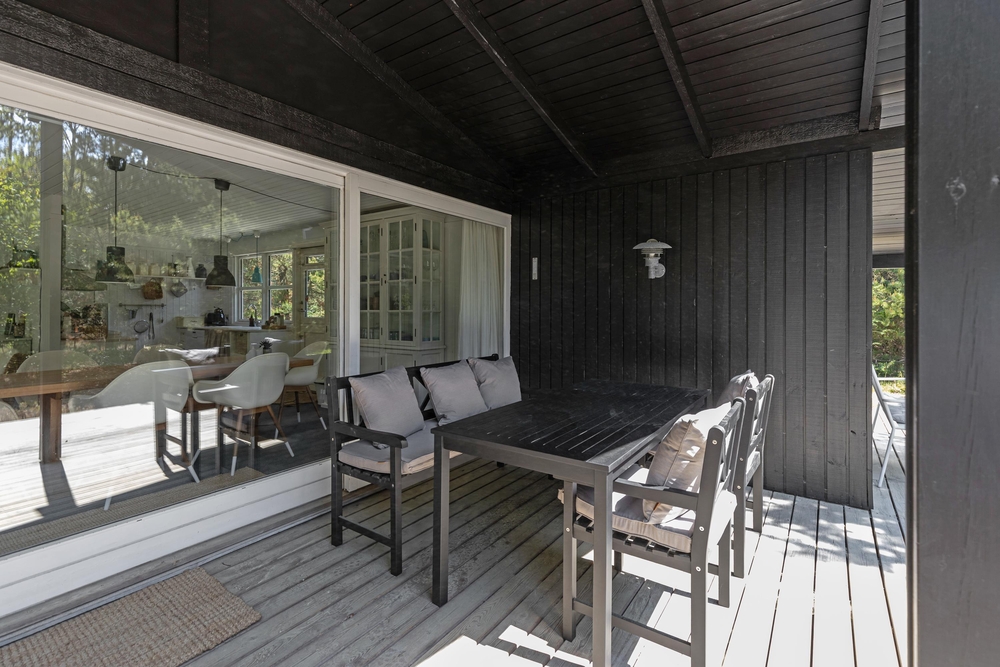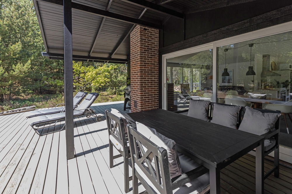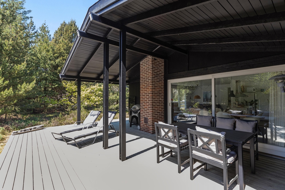 Vom Wohnraum aus gelangt Ihr auf die schöne Holzterrasse, die das Haus an drei Seiten umgibt. Hier findet jeder ein gemütliches Plätzchen um sich entweder zu sonnen oder einfach, um in einem der bequemen Liegestühle, ein kleines Nickerchen zu halten. Nach einem langen Strandtag könnt Ihr auf der teilweise überdachten Terrasse grillen und den Abend gemütlich ausklingen lassen.