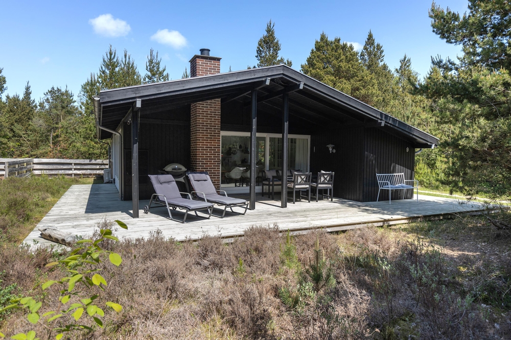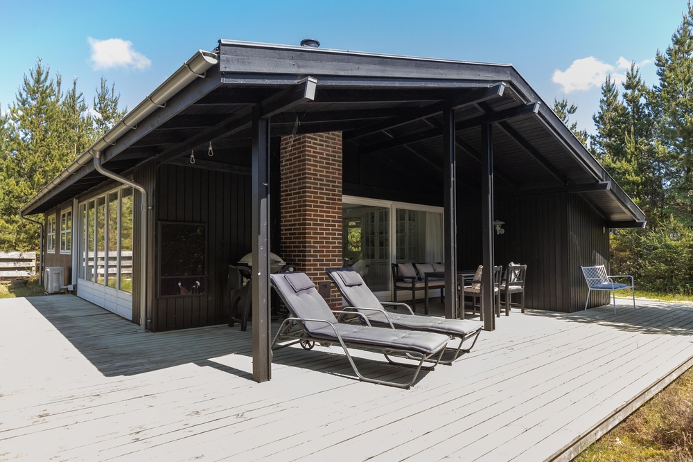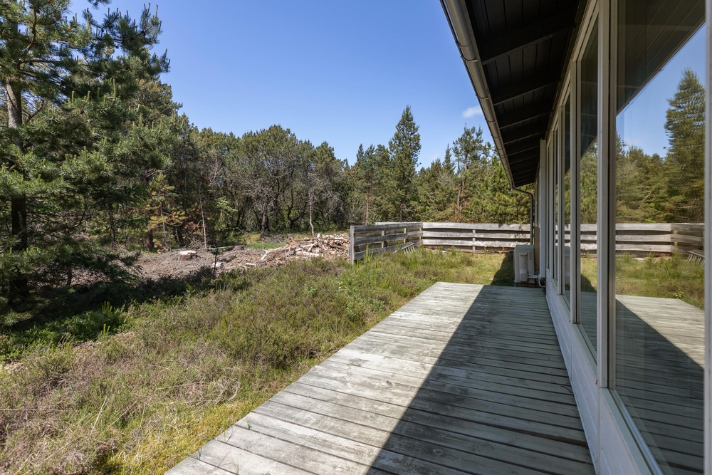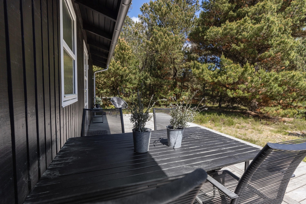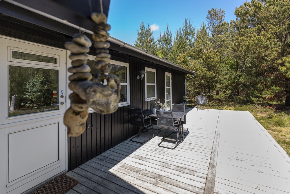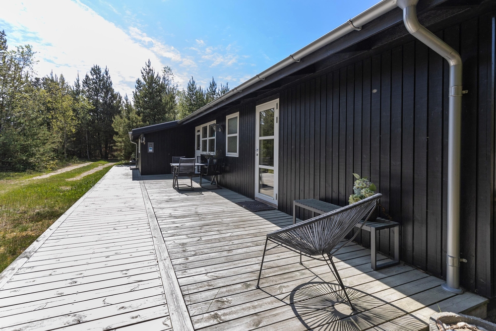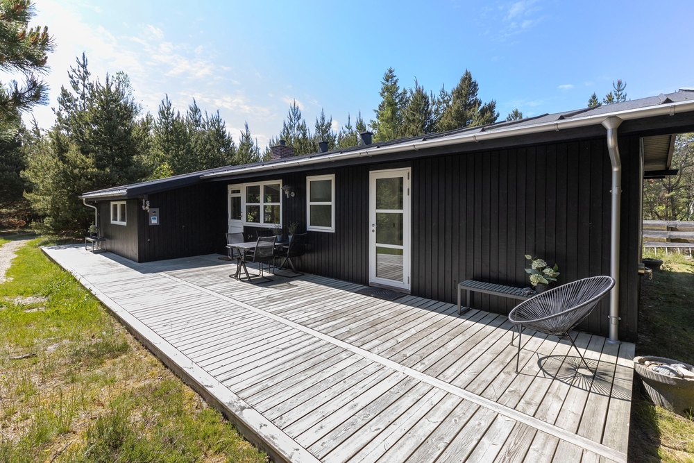 Vom Wohnraum aus gelangt Ihr auf die schöne Holzterrasse, die das Haus an drei Seiten umgibt. Hier findet jeder ein gemütliches Plätzchen um sich entweder zu sonnen oder einfach, um in einem der bequemen Liegestühle, ein kleines Nickerchen zu halten. Nach einem langen Strandtag könnt Ihr auf der teilweise überdachten Terrasse grillen und den Abend gemütlich ausklingen lassen.