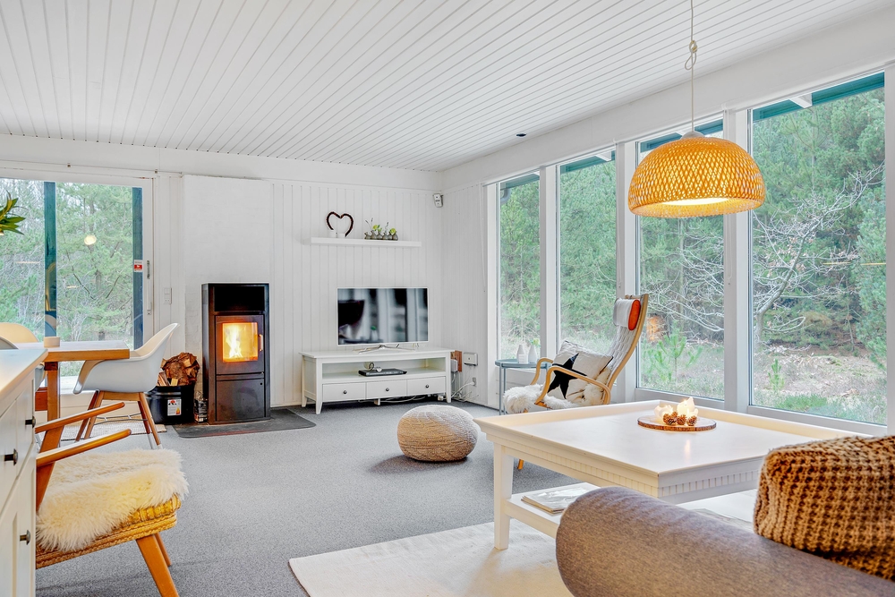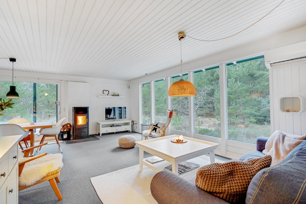 Durch die grossen Panoramafenster habt Ihr vom Wohnraum aus eine wunderschöne Aussicht auf die umliegende Heidelandschaft und die Nadelbäume. Vielleicht seht Ihr ja sogar mal ein Eichhörnchen in den Bäumen spielen.