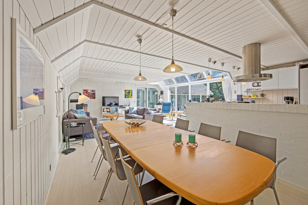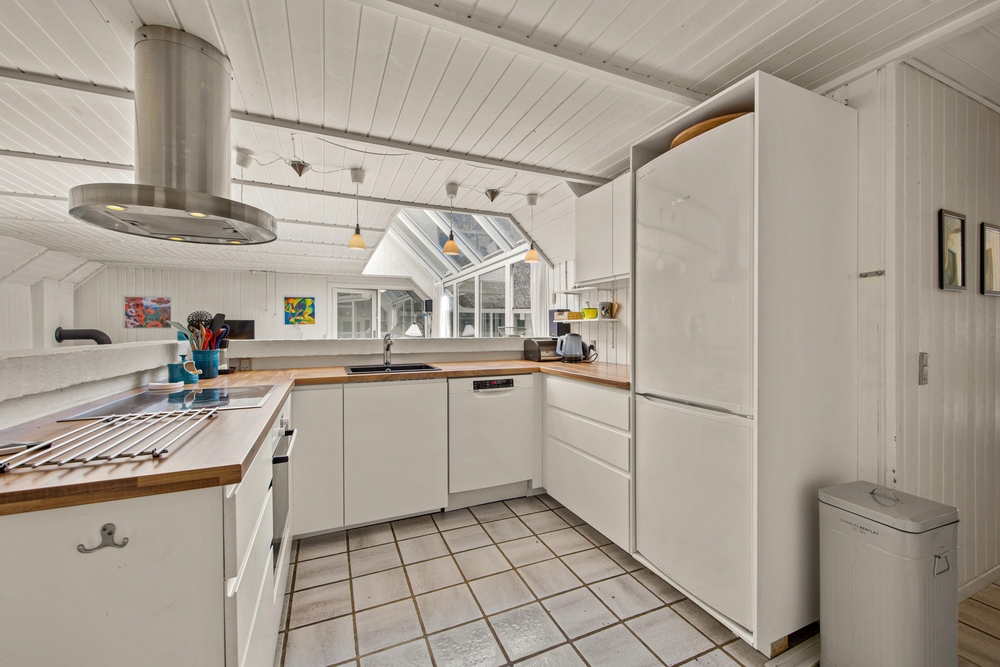 Die helle Einrichtung und der lichtdurchflutete Wohnbereich im Per Knoldsvej 28C sorgen für ein absolutes Wohlfühl-Ambiente. Im offenen Wohnbereich mit Küche und Esstisch spielt sich in diesem Haus das Leben ab. Auf den gemütlichen Sofas könnt ihr euch einkuscheln, den Kamin anmachen, die Wärme und das Knistern des Feuers genießen, und dabei den Blick durch die große Fensterfront ins Grüne schweifen lassen. Die Küche ist durch einen Tresen vom Wohnbereich abgetrennt. Hier könnt ihr gemeinsam leckere Menus für eure Liebsten zubereiten.
