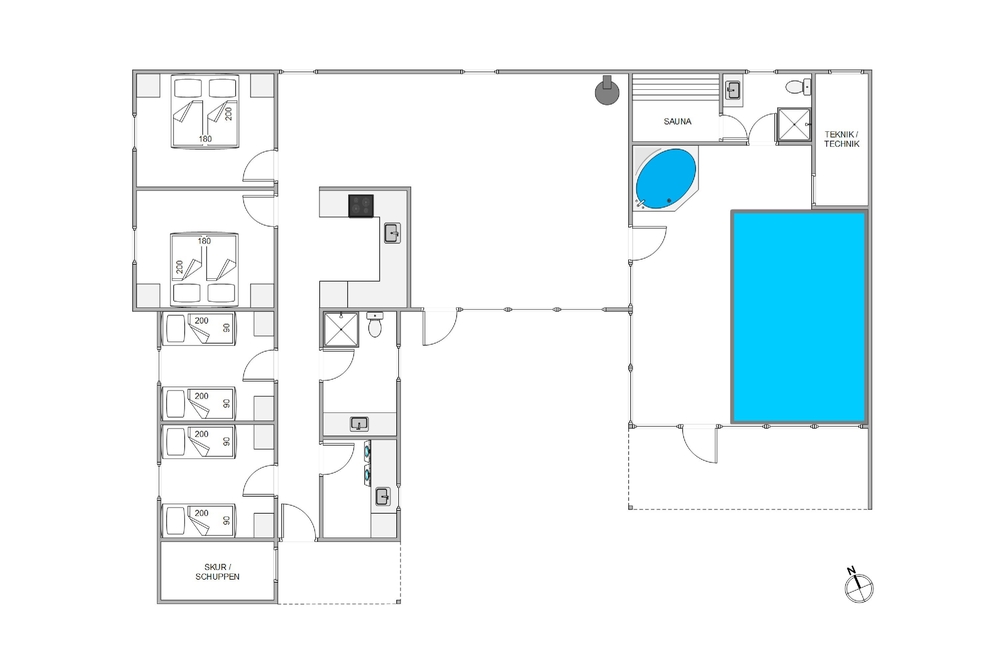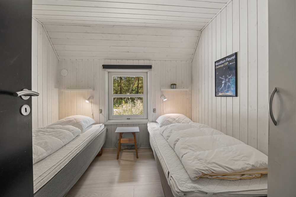 Das Ferienhaus hat insgesamt vier Schlafzimmer, zwei mit Doppelbetten und zwei mit zwei Einzelbetten. Hier findet ihr ungestört in euren wohlverdienten Schlaf, und könnt neue Energie tanken. Morgens könnt ihr euch auf zwei voll ausgestattete Badezimmer aufteilen. Das eine Badezimmer ist direkt bei den Schlafzimmern, und das andere im Pool-Raum. Beide haben eine Duschnische und eine Fußbodenheizung.