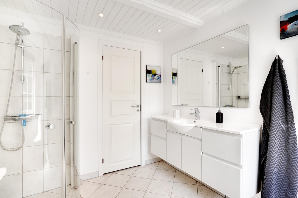 Das Badezimmer mit Fussbodenheizung, Waschmaschine und Trockner ist hell und grosszügig sowie bietet ausreichend Stauraum für all eure Kosmetikartikel.