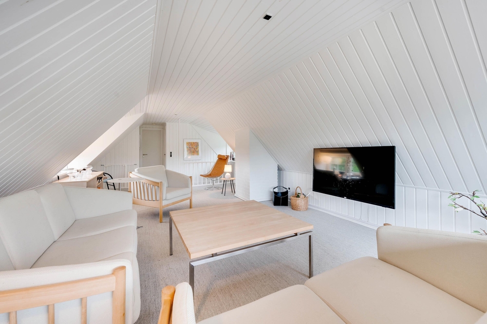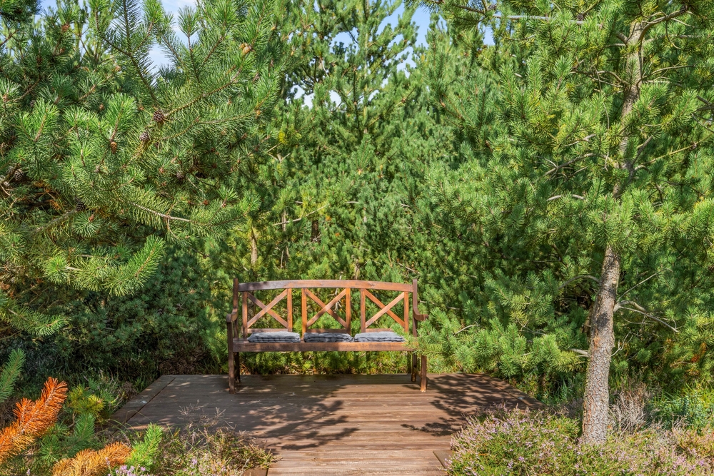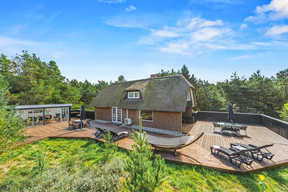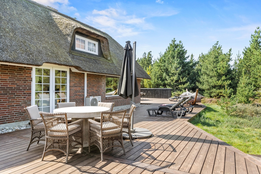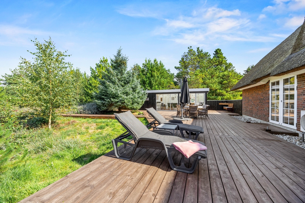 Die 250 m2 große, teilweise geschlossene Terrasse ist mit guten Gartenmöbeln, Liegestühlen und einem Grill für die warmen Sommerabende ausgestattet. Hier findet die ganze Familie und der Hund einen Platz in der Sonne. Auf dem tollen Grundstück gibt es zudem eine schöne und beheizbare Hütte, wo ihr sitzen und den Blick ins Grüne genießen könnt, wenn es Abend wird. Hier ist Platz für 8 Personen, um am Tisch zu sitzen, sich zu amüsieren ? vielleicht bei einem Spieleabend oder einfach mit Knabbereien und bei einem guten Glas Wein.