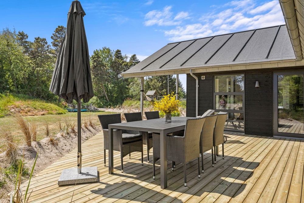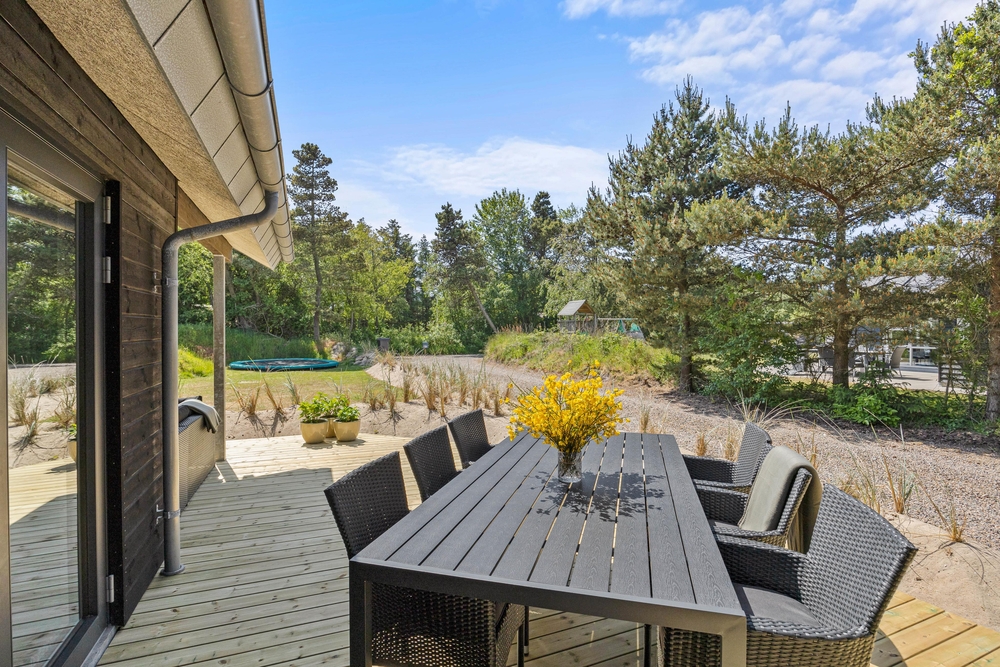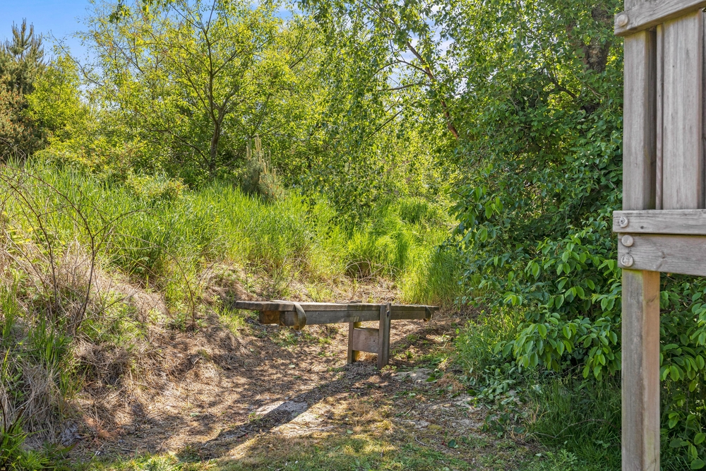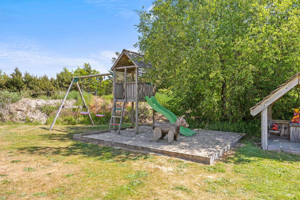 Euer Ferienhaus liegt auf einem traumhaft, großen Grundstück geschützt von Kiefern und Sträuchern. Die Kinder haben hier viel Platz zum Spielen und die Natur zu entdecken. Außerdem gibt es Sandkasten, Schaukeln und eine Wippe für die Kleinen Gäste. Den Kindern wird also bestimmt nicht langweilig, während ihr die Sonne in den Liegestühlen auf der schönen Holzterrasse genießt.