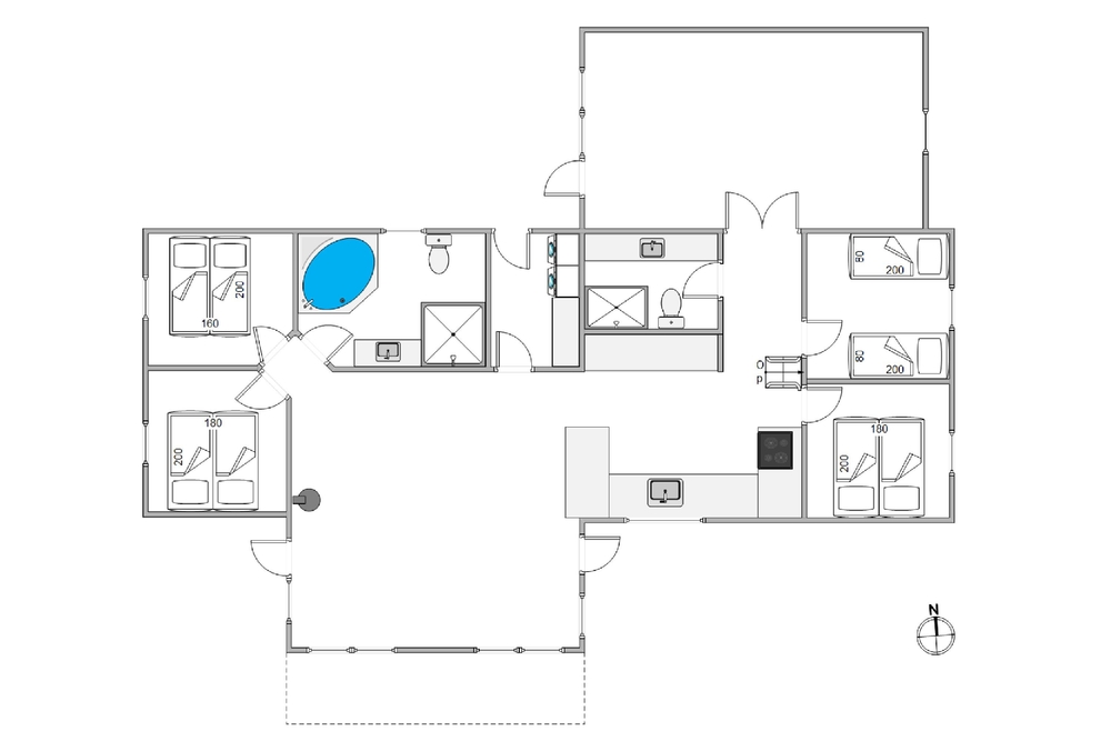 Das Ferienhaus hat 4 Schlafzimmer, drei davon mit Doppelbetten, und eins mit zwei Einzelbetten. Außerdem gibt es zwei vollwertige Badezimmer, jeweils mit Duschnische, und in einem der Bäder den Whirlpool.