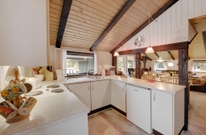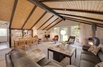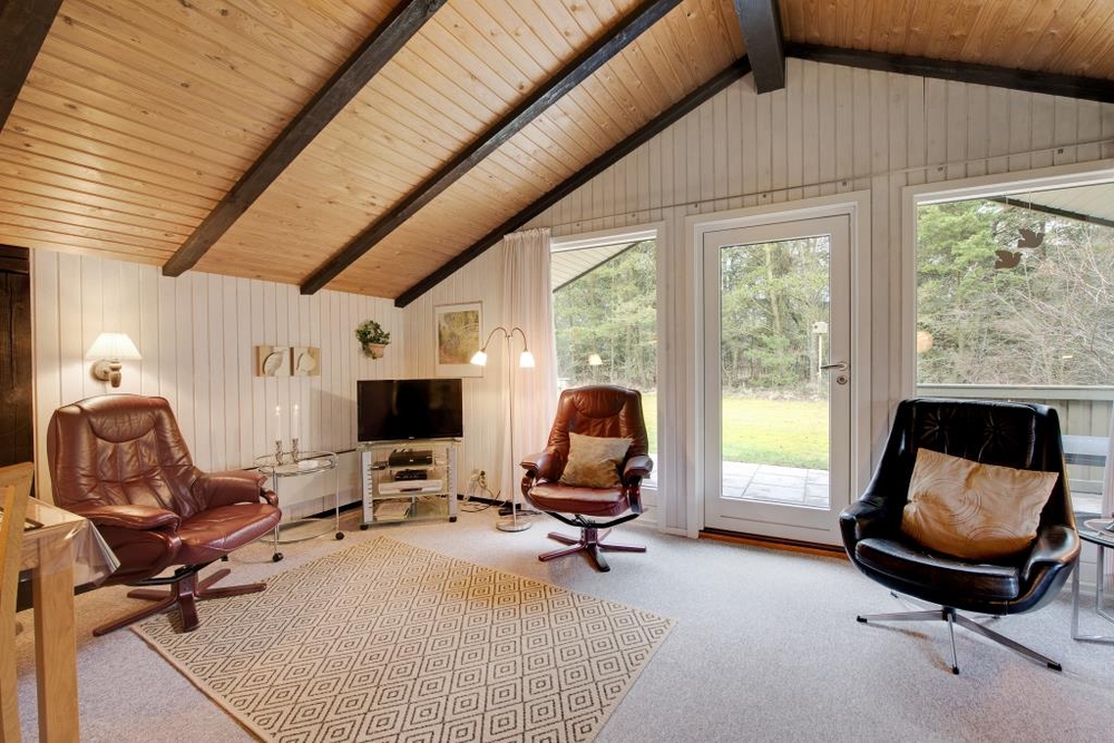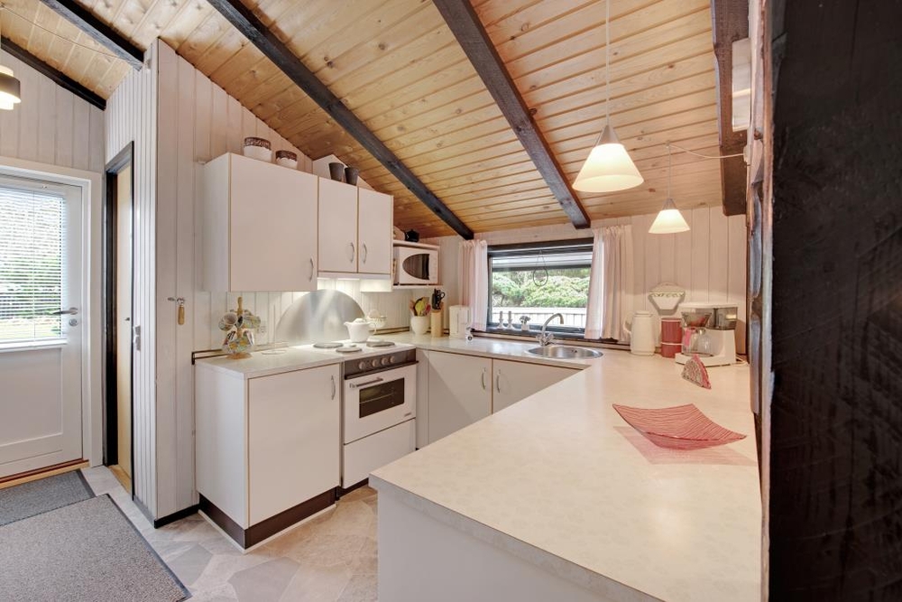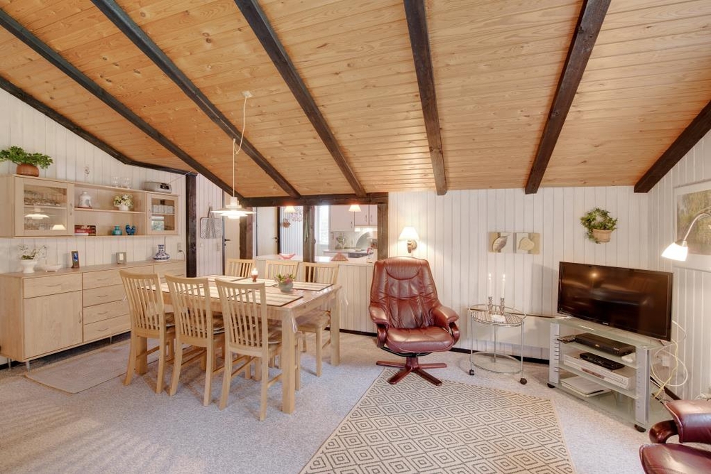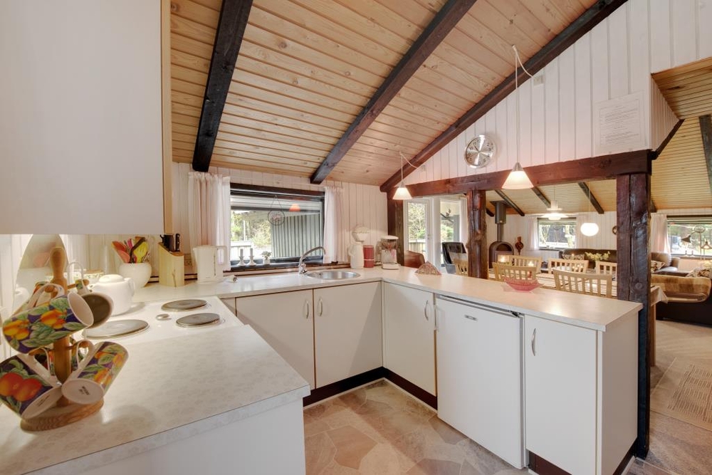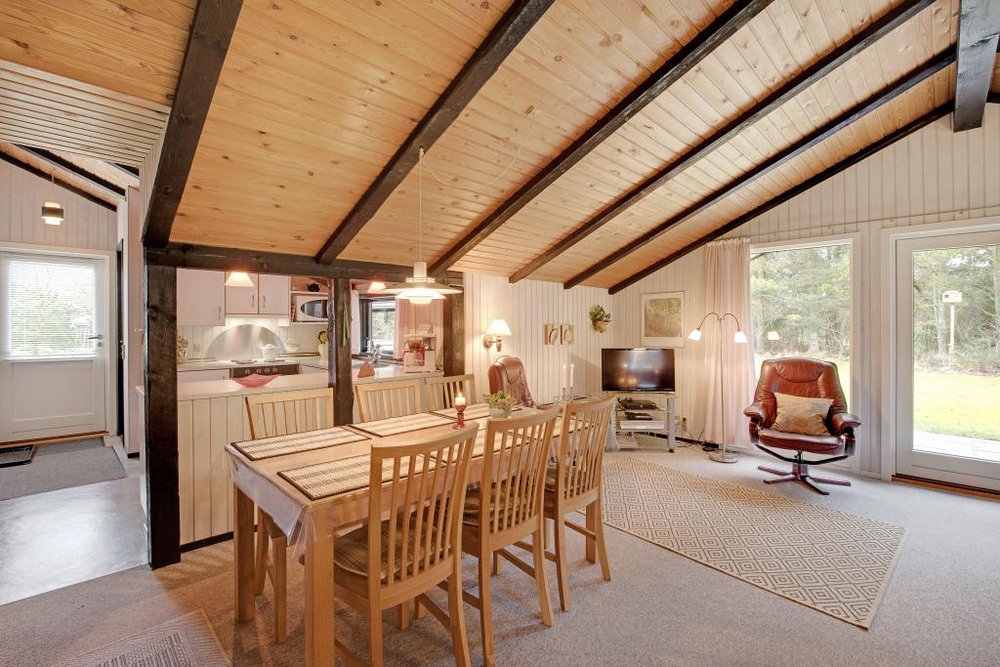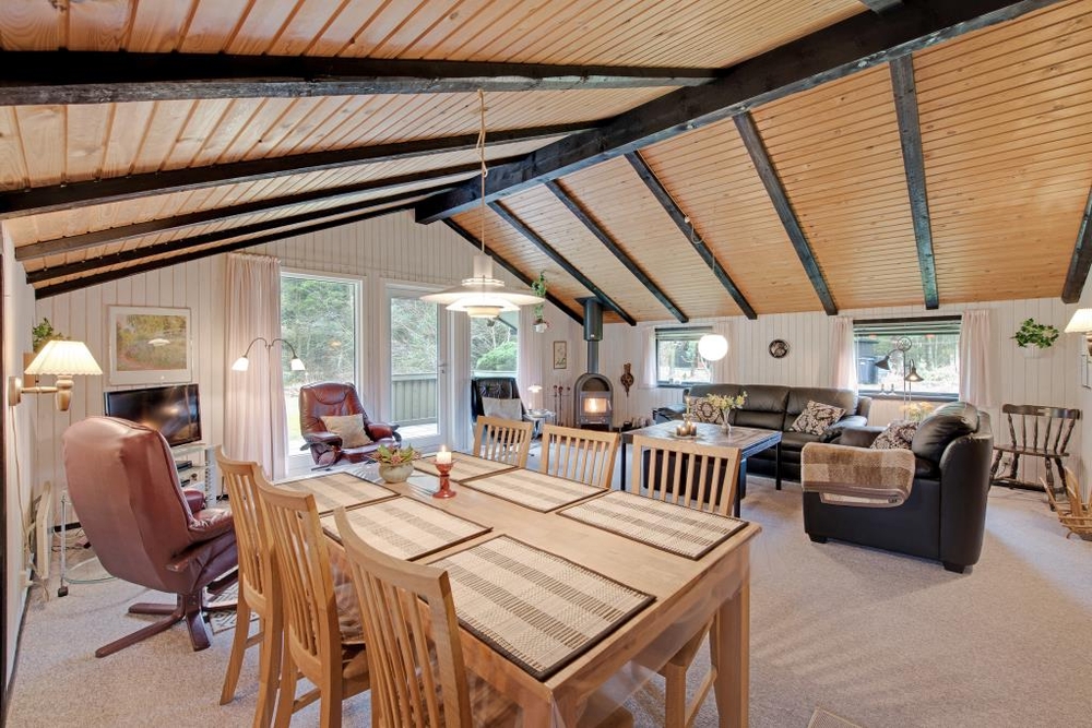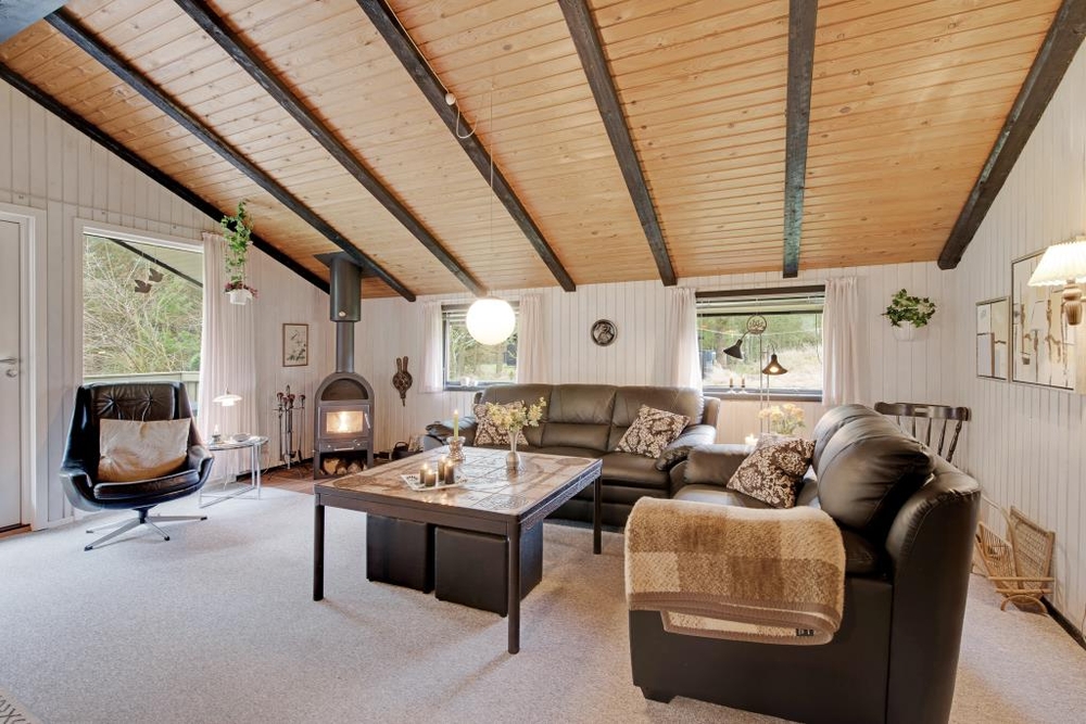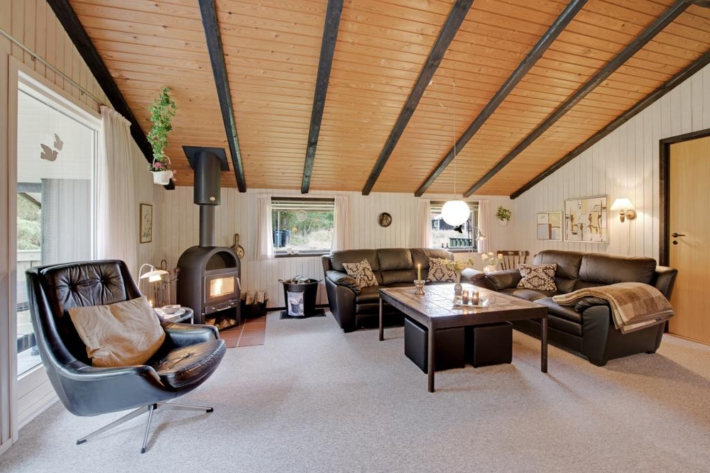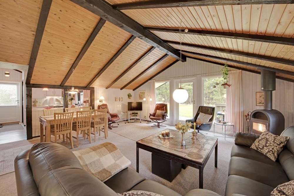 Der gemütliche Wohnraum mit der halboffenen Küche ist der Mittelpunkt des Hauses. Hier kann sich die ganze Familie vor dem knisternden Kaminofen versammeln und die wohlige Wärme geniessen. Die dunkleren sichtbaren Balken sorgen für eine typisch dänische Sommerhausstimmung.