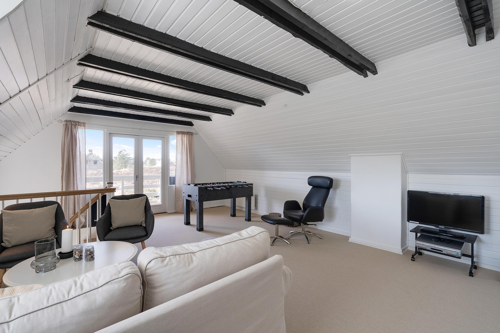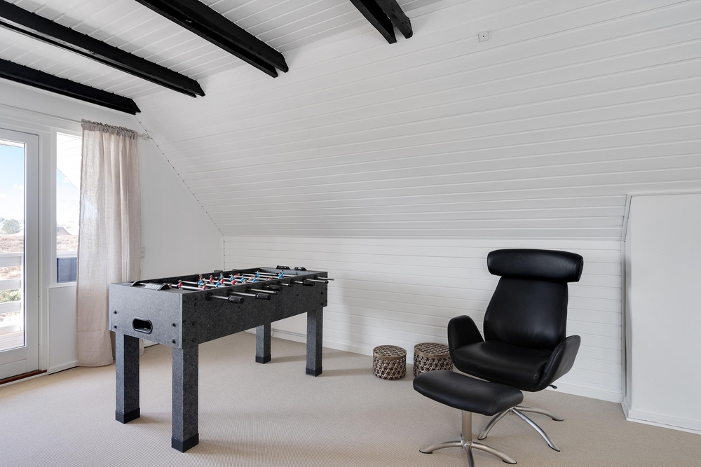 Wer es gern gemütlich mag, legt die Beine entspannt vorm Kaminofen hoch und liest vielleicht mal wieder ein spannendes Buch. Wer hingegen lieber noch ein bisschen auf dem Balkon draußen sitzen möchte, geht nach oben und macht es sich dort bequem. Platz und Auswahlmöglichkeiten gibt es hier genug. Eine moderne Wärmepumpe sorgt für angenehme Temperaturen im Haus. Ein Kicker sorgt für Abwechslung und Unterhaltung.