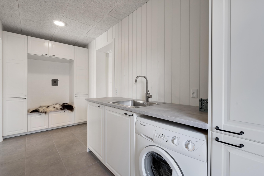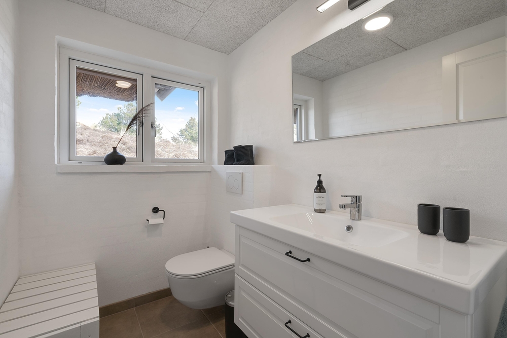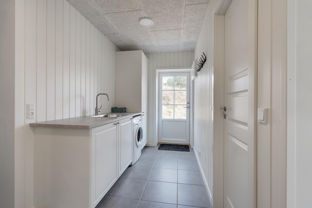 Das Badezimmer sowie das dritte Schlafzimmer liegen ebenfalls im Erdgeschoss des Ferienhauses. Eigentlich ganz praktisch für die Frühaufsteher unter euch. Denn während ihr schon einmal das Frühstück vorbereitet, können die Langschläfer sich im Obergeschoss noch einmal auf die Seite drehen. Das Ferienhaus verfügt zudem über einen kleinen Tresor und in dem praktischen Flur steht die Waschmaschine. Darüberhinaus habt ihr genügend Stauraum für eure Garderobe.