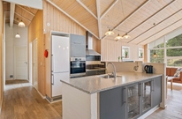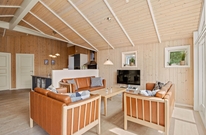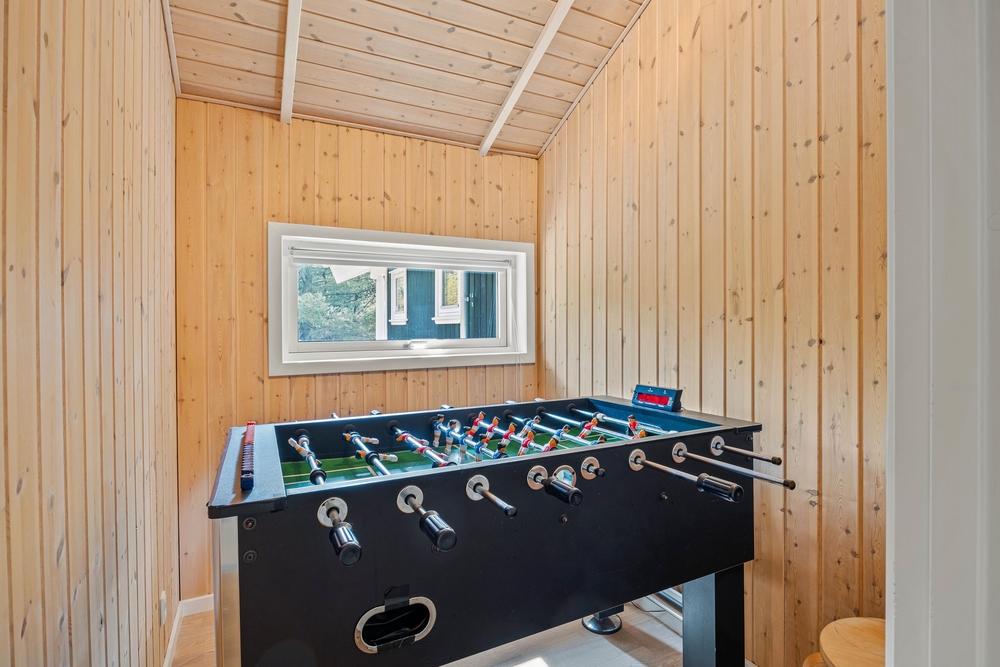 Wohnbereich, Essplatz und Küche bilden eine Einheit und sind der Treffpunkt für gemeinsame Stunden. Die hohen ausgebauten Dachschrägen geben den Räumen ein sehr gemütliches Ambiente. Wenn dann noch das Feuer im Kaminofen lodert, wird es richtig ?hyggelig?. Falls aber doch mal sowas wie Langeweile aufkommen sollte, könnt ihr euch am Tischkicker die Zeit vertreiben.