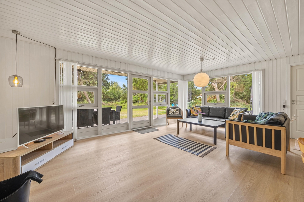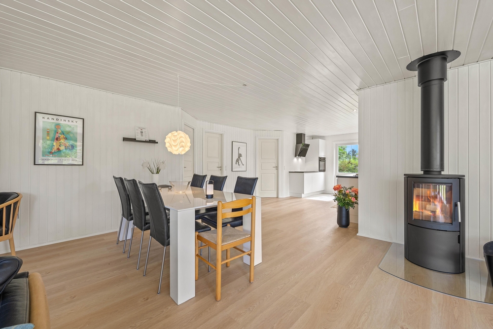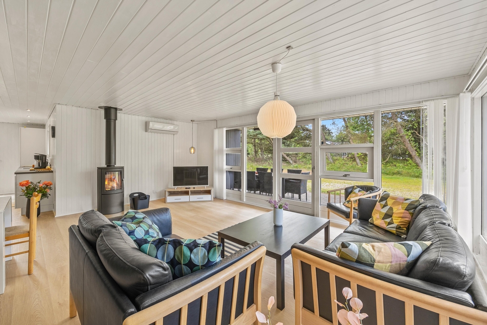 In diesem einladenden Ferienhaus steht der komfortabel ausgestattete Wohnraum im Zentrum. Hier könnt ihr euch vorm Kamin versammeln, fernsehen oder einen geselligen Spieleabend verbringen. Die energiesparende Wärmepumpe sorgt für eure Wohlfühltemperatur, wenn ihr den Kamin mal nicht nutzen möchtet. Die zahlreichen Fenster, die natürlichen Farbtöne und bequemen Sitzmöbel, ergeben ein harmonisches Gesamtbild, das zur Entspannung beiträgt.