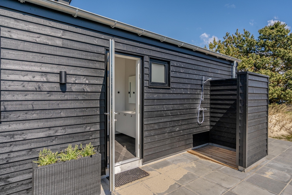 Zum Ferienhaus gehört eine große, teilweise überdachte Terrasse, auf der alle 10 Urlauber problemlos einen schönen Platz in der Sonne finden. Natürlich gibt es passende Gartenmöbel und Liegestühle, damit du die schönen Sommertage optimal nutzen kannst. Nach einem Spaziergang am Strand kannst du mit der Außendusche den Sand von deinen Füßen spülen oder eine erfrischende Dusche nehmen. Die Dusche steht ab 1.April bis 31. Oktober zur Verfügung.