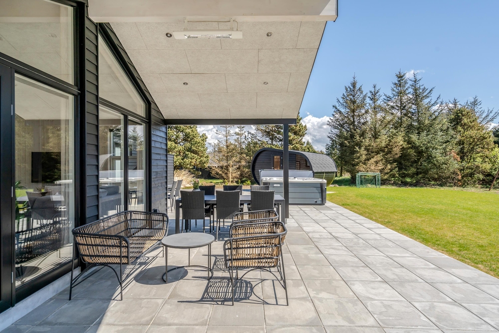 Die Terrasse bietet eines der absoluten Highlights des Hauses. Hier befindet sich der große Außenwhirlpool mit Sitzgelegenheiten für 6 Personen. Es gibt kaum einen besseren Abschluss als Zeit im sprudelnden Whirlpool unter freiem Sternenhimmel zu verbringen.