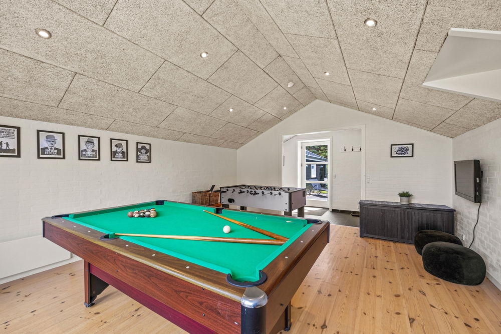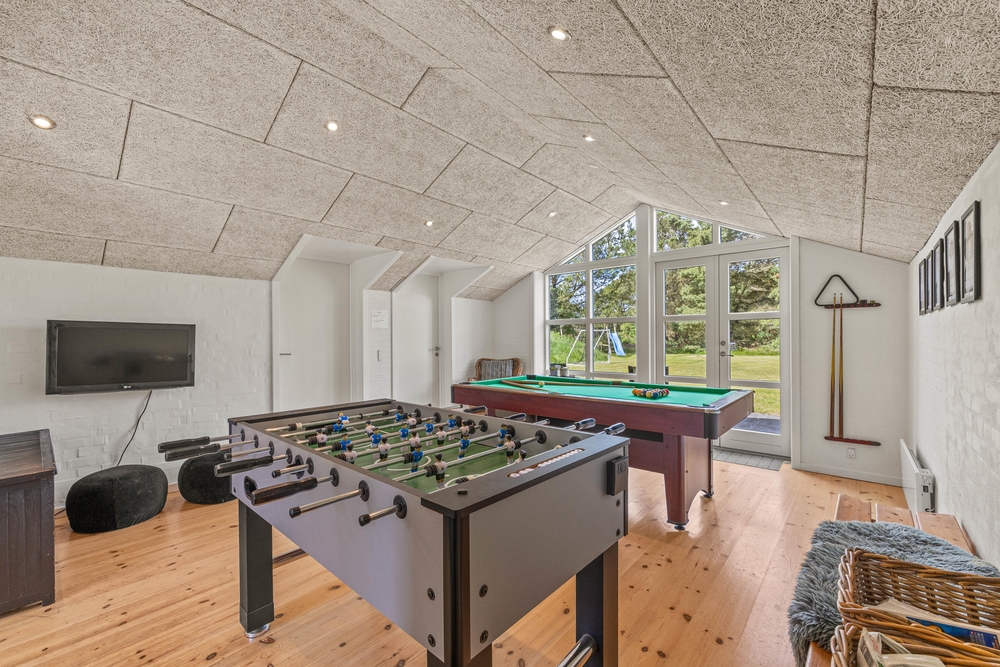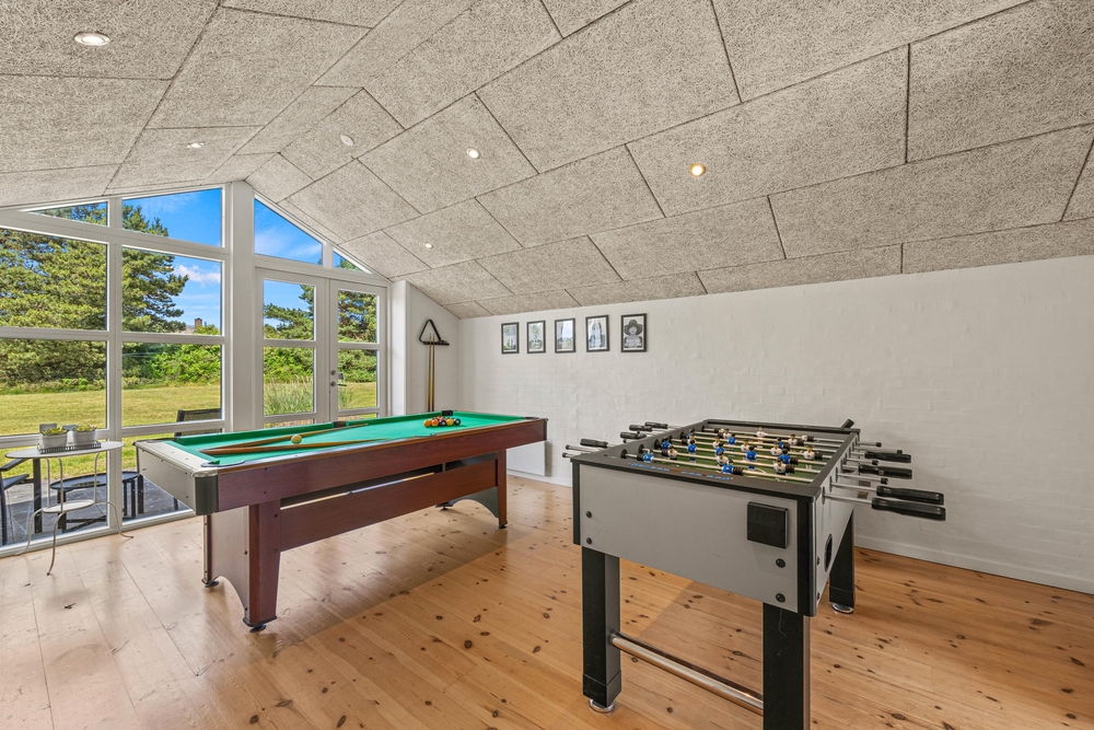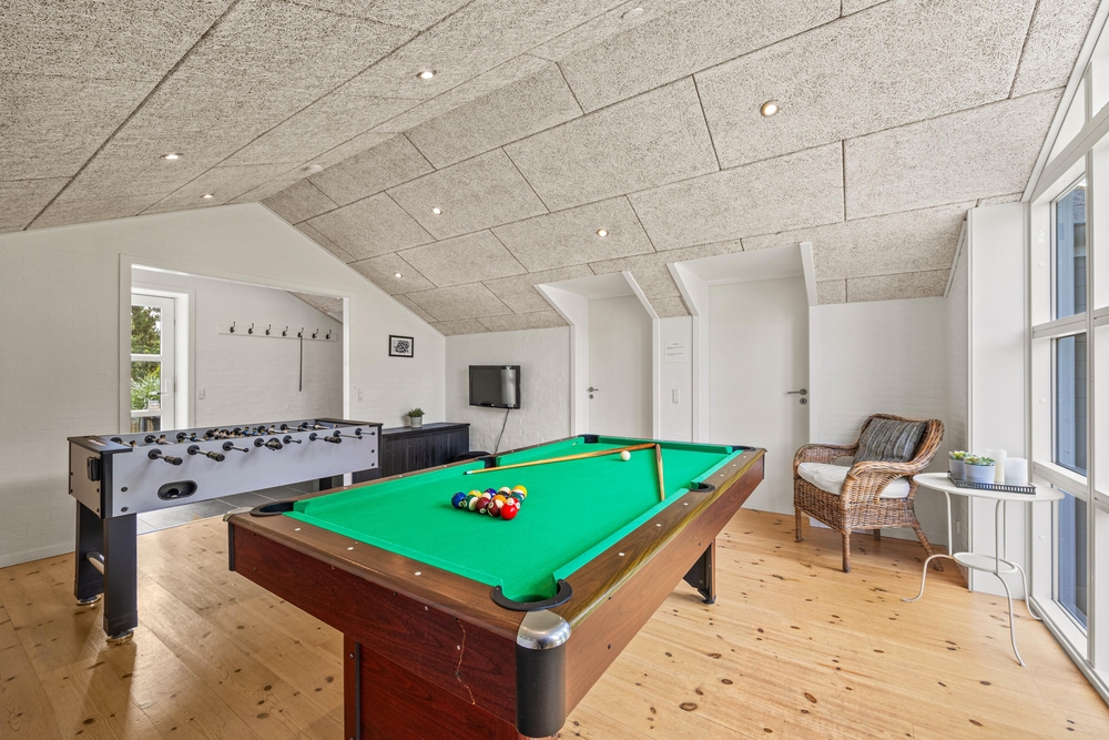 Neben den bereits genannten Annehmlichkeiten bietet das Ferienhaus auch zahlreiche Möglichkeiten für Unterhaltung und sportliche Aktivitäten. Der großzügige Wohnbereich lädt zu gemeinsamen Filmabenden ein, während im Aktivitätsraum spannende Spielturniere am Poolbillardtisch und am Tisch-Kicker für Unterhaltung sorgen.