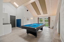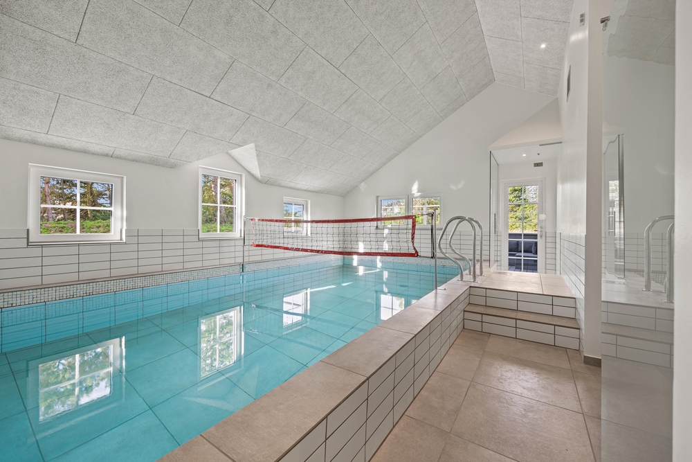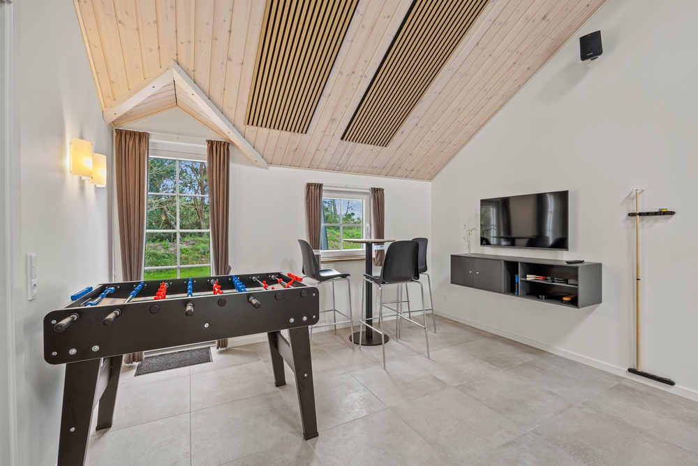 Helle, lichtdurchflutete Räume mit hohen Decken begrüßen euch beim Betreten des Ferienhauses auf Pouls Bjerge 6. Der großzügige Wohnbereich der Küche, Essplatz und Wohnzimmer vereint, ist das Herzstück des Hauses, in dem ihr zusammenkommt, um gemütliche Stunden miteinander zu verbringen. Eine moderne, gut ausgestattete Küche, ein Aktivitätsraum mit Billard und Tischtennis und ein Poolraum mit Dampfsauna sorgen für eine unvergessliche Urlaubszeit.