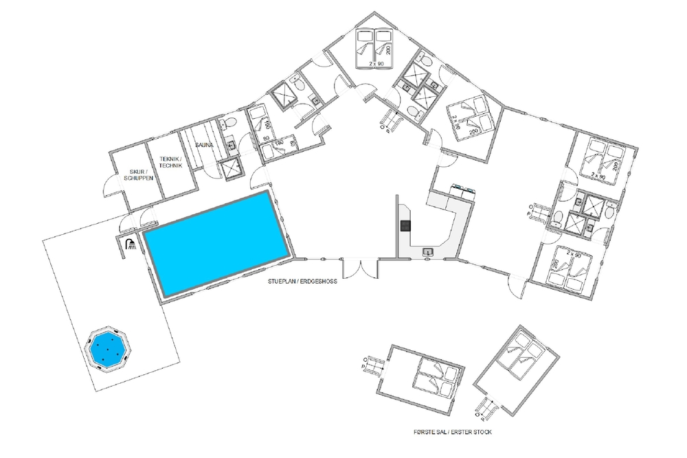 Das 215 Quadratmeter große Ferienhaus verfügt außerdem über fünf Schlafzimmer und jedes Zimmer hat ein eigenes Badezimmer. Eines der Schlafzimmer ist mit 2 Einzelbetten ausgestattet, während jedes der anderen 4 Schlafzimmer ein Doppelbett hat. Überall im Haus ist eine Fußbodenheizung installiert.