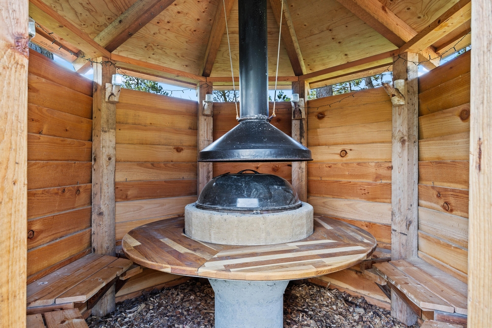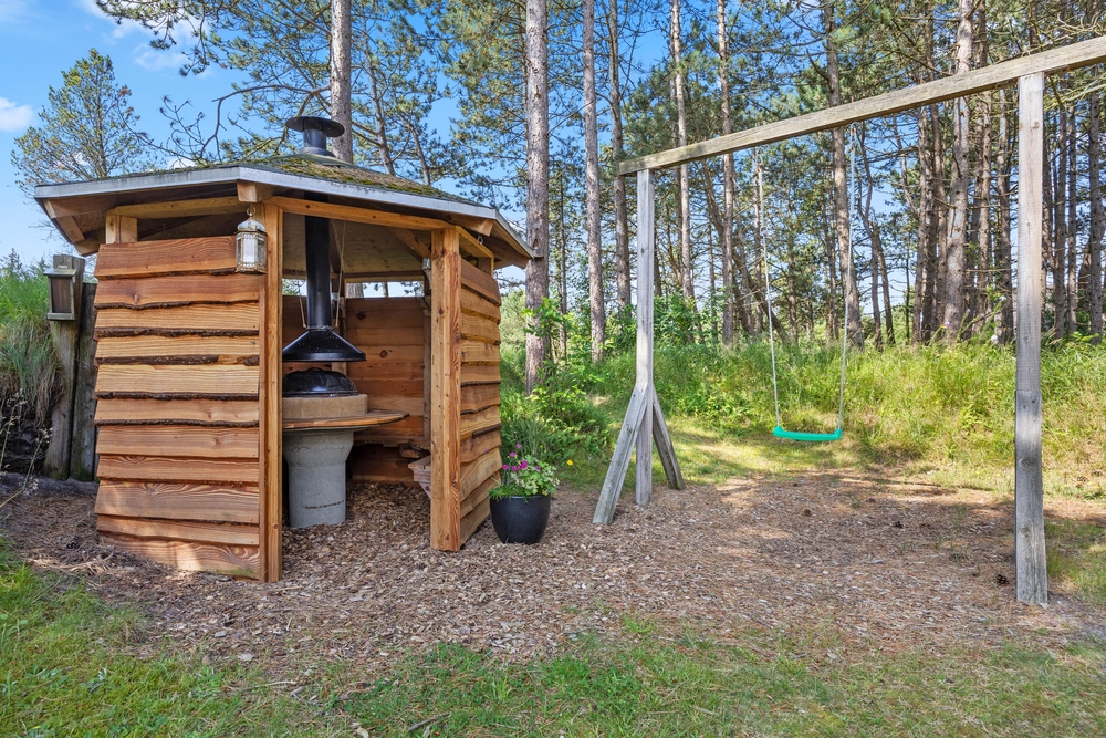 Der Outdoor-Bereich des Hauses ist ein echtes Highlight. Auf der abgeschirmten und überdachten Terrasse könnt ihr laue Sommerabende genießen. Für Kinder ist das Grundstück ein wahres Paradies, mit einer Schaukel und einem Trampolin. Zudem gibt es eine Feuerstelle, die perfekt für Lagerfeuerabende geeignet ist. Der Shelter bietet eine einzigartige Möglichkeit, unter dem Sternenhimmel zu übernachten und das Abenteuer-Feeling hautnah zu erleben.