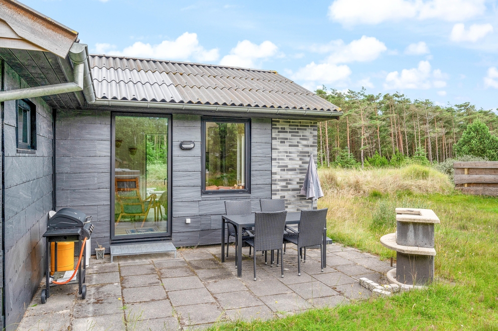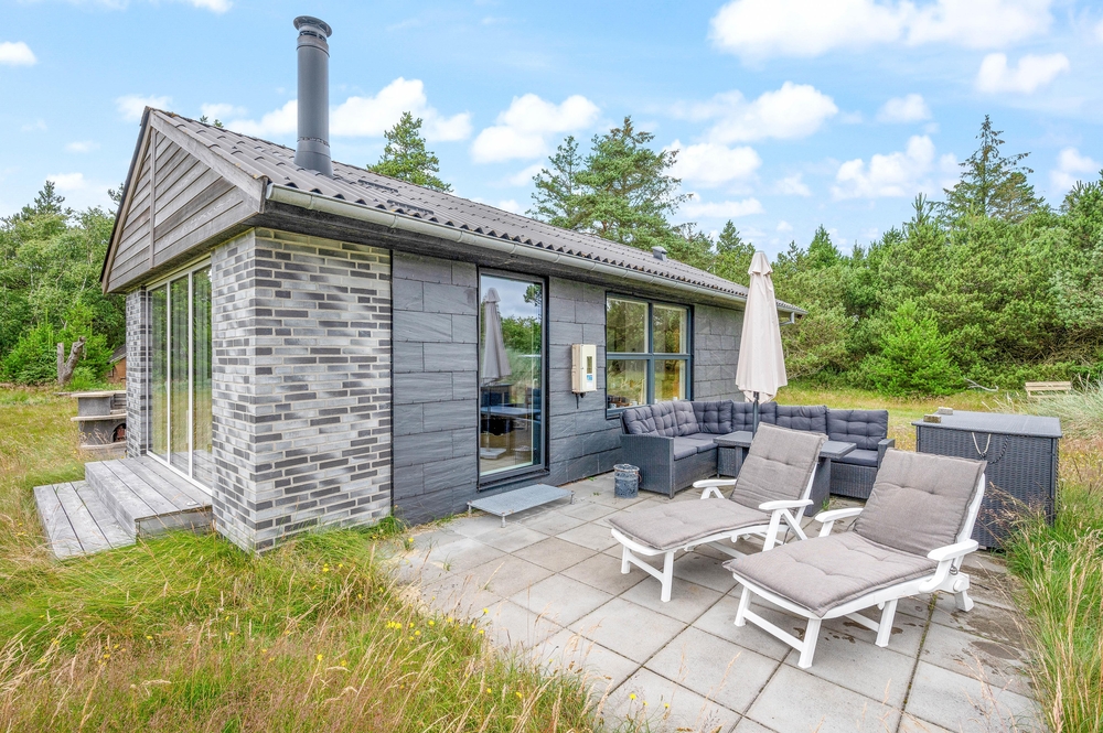 Das Ferienhaus bietet einen schönen Außenbereich mit geschützter Terrasse und einem schönen Naturgrund. Auf der Terrasse findet ihr sowohl Gartenmöbel als auch Sonnenliegen.
