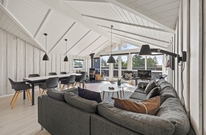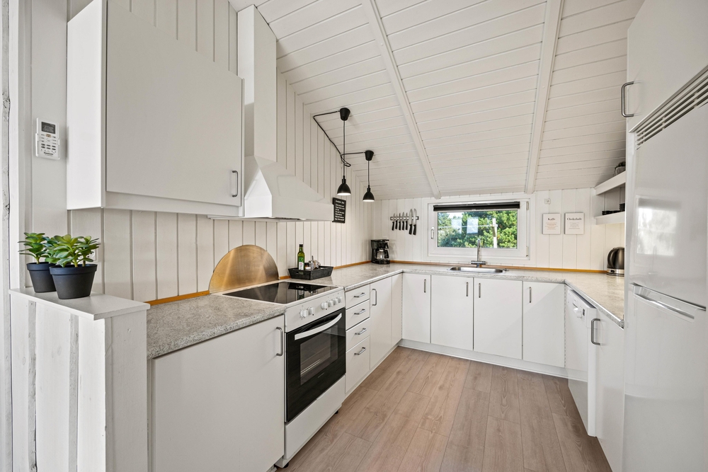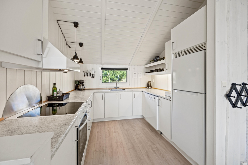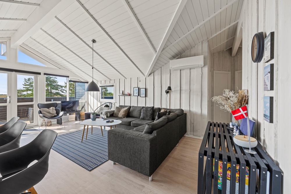 Der einladende, helle Wohnbereich im typisch skandinavischen Stil, beinhaltet einen großzügigen Essplatz und die offene, gut ausgestattete Küche. Hier kann sich die ganze Familie versammeln, um einen guten Film im Fernsehen zu sehen, gemeinsam zu kochen oder ein lustiges Brettspiel zu spielen. Es herrscht eine gemütliche Atmosphäre und durch die großen Südfenster gibt es viel natürliches Licht im Ferienhaus.