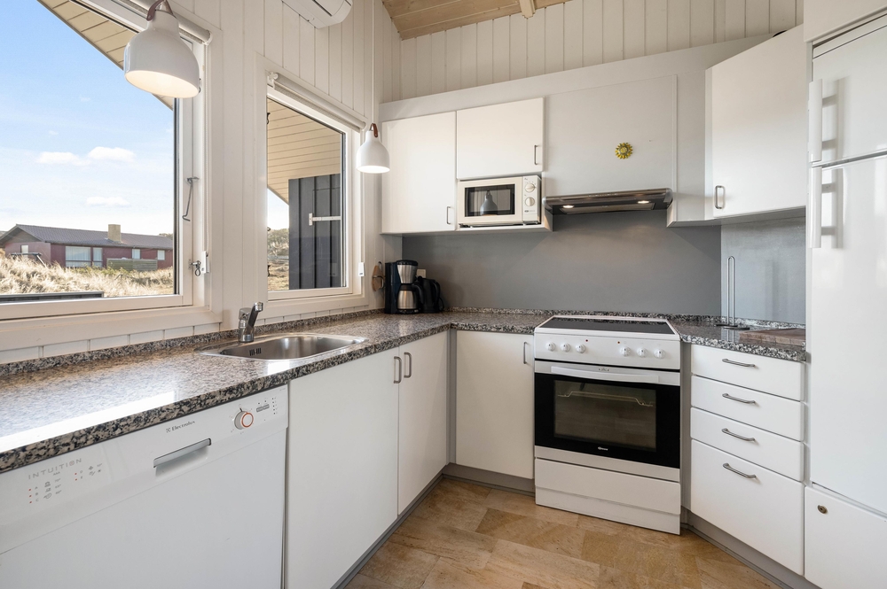 Das Herzstück des Ferienhauses ist der helle und einladende Wohnraum, mit bequemen Möbeln und einem Kaminofen, der euch an kühleren Abenden wohlige Wärme schenkt. Große Fenster sorgen für viel Tageslicht und bieten einen herrlichen Blick in die Dünenlandschaft. Die offene Küche ist vollständig ausgestattet und verfügt über alle modernen Annehmlichkeiten, wie einen Geschirrspüler, einen Herd und eine Mikrowelle. Hier könnt ihr eure Mahlzeiten ganz bequem zubereiten und anschließend gemeinsam am Esstisch genießen.