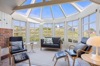 Das schöne Wohnzimmer ist mit guten Möbeln, einem knisternden Holzofen, TV, DVD, Radio und CD-Player ausgestattet. Der Wohnraum wird durch einen atemberaubenden Erker erweitert, der den Raum vergrößert und für eine wunderbare Lichtdurchflutung sorgt. Von hier aus könnt ihr auch die wunderbare Aussicht auf die Moorlandschaft rund um das Ferienhaus genießen. Es ist fast so, als stünde man auf seinem eigenen Aussichtspunkt, wenn man sich an der Vorderseite des Erkerfensters befindet.