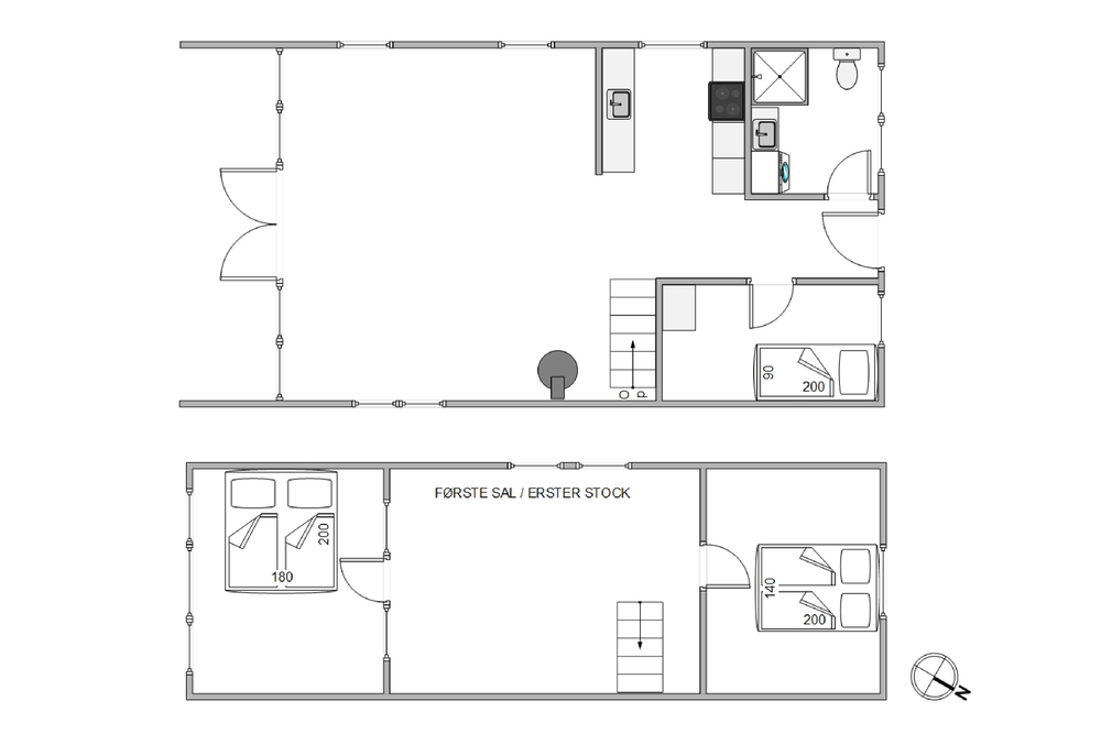 Der Aufenthaltsraum im Erdgeschoss bildet das Herz des Hauses: Hier werden das Wohnzimmer und die Küche in einem Zimmer kombiniert. Auch der Kaminofen befindet sich im Aufenthaltsraum und sorgt das ganze Jahr hindurch für eine gemütliche Wärme und schöne, knisternde Stimmung. Im ersten Stock ist ein zweites Wohnzimmer vorhanden.