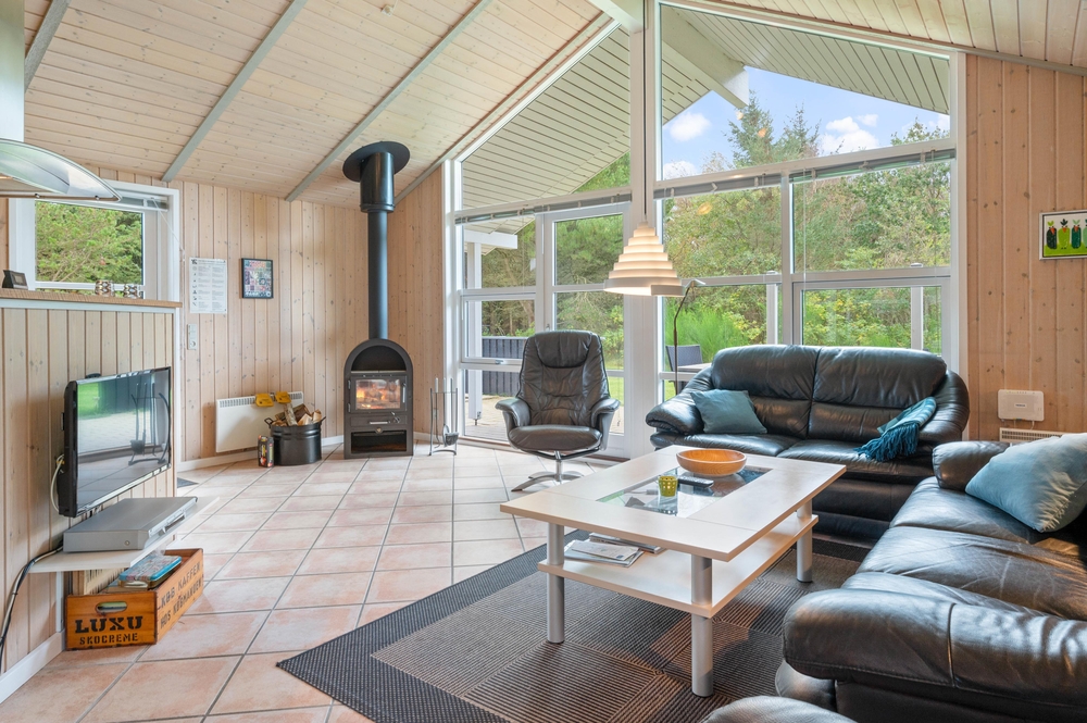 Die große Wohnküche ist mit offener Küche, Essbereich und Wohnzimmer praktisch eingerichtet und dient als perfekter Treffpunkt des Hauses. Die Einrichtung ist geschmackvoll und gemütlich, welche den skandinavischen Minimalismus ausstrahlt. Das Wohnzimmer lädt mit seinen weichen Sofas und bequemen Sesseln sowie dem Kaminofen zum Entspannen ein. Alternativ zum Kamin sorgt eine Wärmepumpe für angenehme Raumtemperaturen.