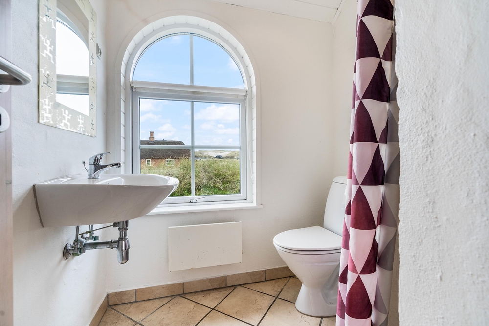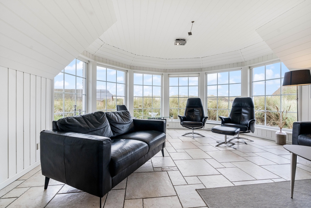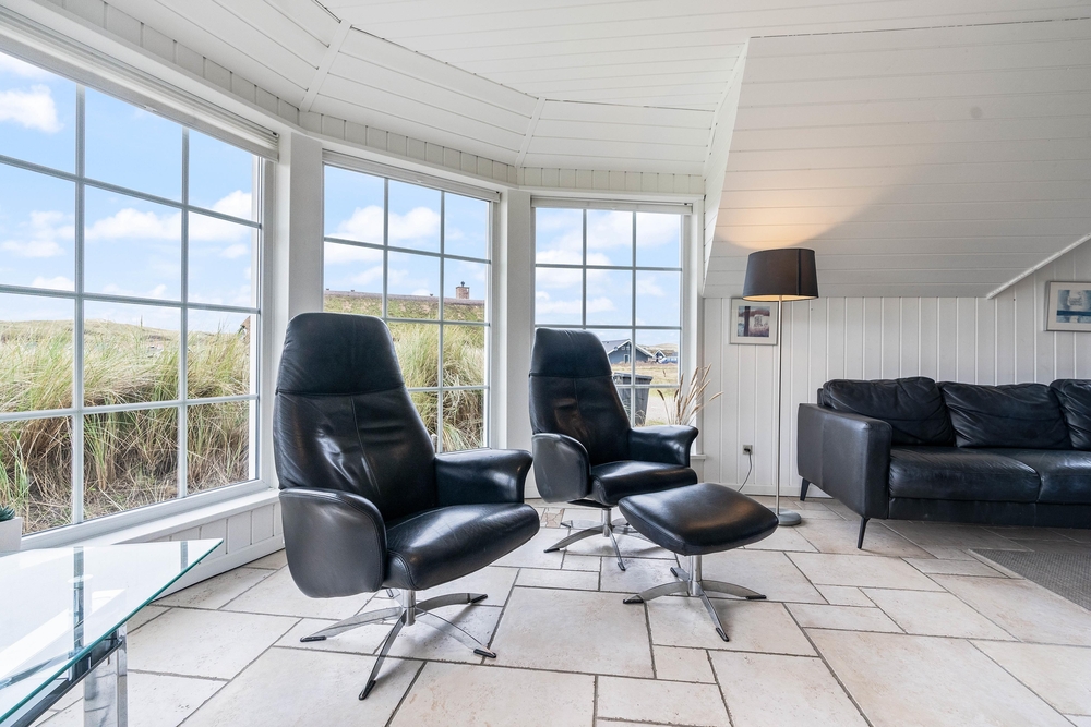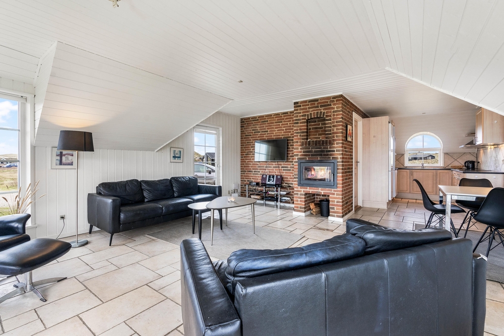 Während der Kaminofen knistert, könnt ihr euch auf der Couch versammeln oder die schöne Aussicht auf die Dünen durch die großen Fenster genießen. Sowohl der Wohnbereich, als auch die Badezimmer und der Eingangsbereich haben pflegeleichte Fliesenböden, und im Eingangsbereich findet ihr die Waschmaschine und den Trockner.