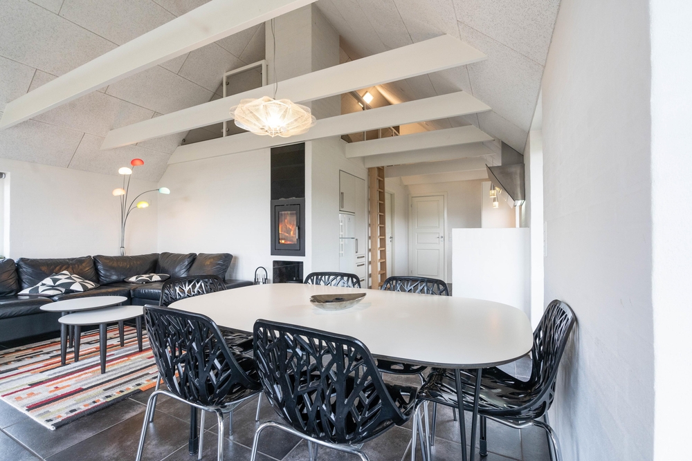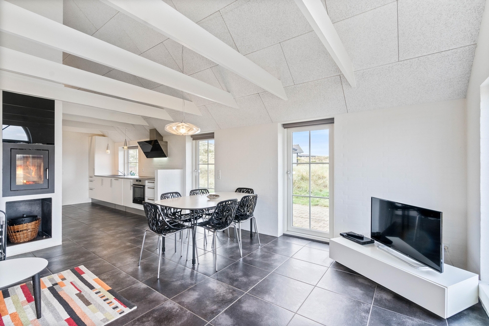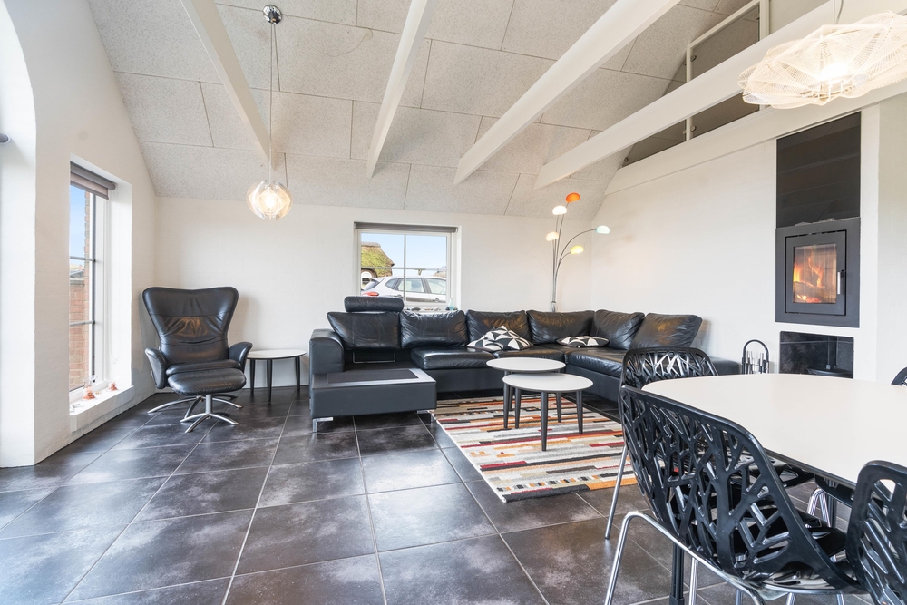 Dieses schöne Reetdachhaus ist von innen modern und schick gestaltet. Der offene Wohnbereich mit seinen hohen Decken, moderner Einrichtung und der großen Fensterfront lädt zum Entspannen auf dem bequemen Sofa ein. Schnappt euch euer Lieblingsbuch, schaut Fernsehen und genießt das Knistern des Kaminfeuers. Eure Kinder können derweil auf dem Hängeboden spielen oder sich einkuscheln.