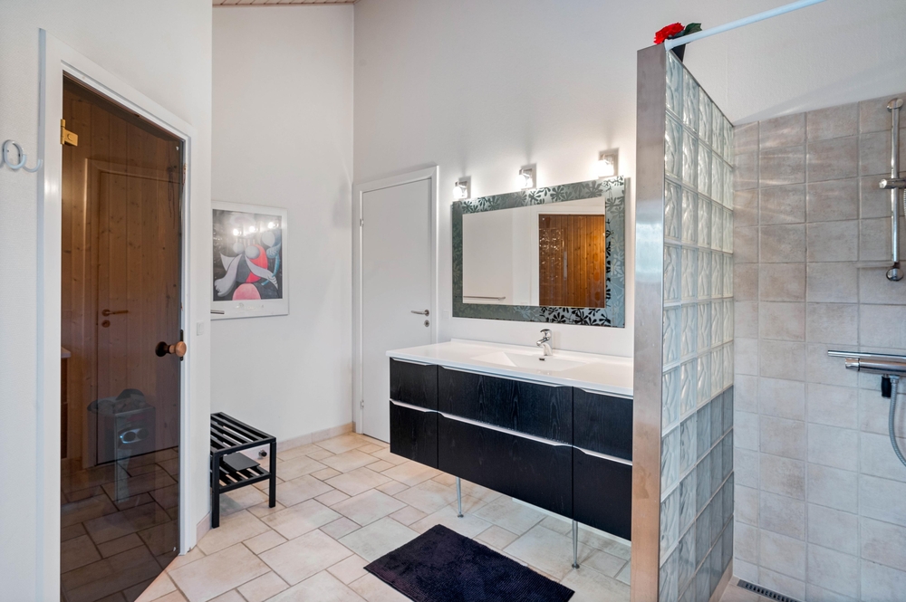 Es sind zwei schöne Badezimmer im Haus ? das eine mit Whirlpool und Sauna, die Ihr nach einem schönen Spaziergang am Strand durchwärmen und entspannen lasst.