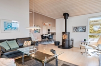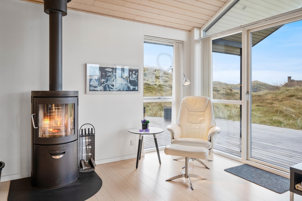 Im Wohnzimmer ist die Decke firsthoch und zusammen mit der großen Fensterfront sorgt sie dafür, dass Ihr mit Geräumigkeit und einer schönen Aussicht über die Naturlandschaft verwöhnt werdet, während der Kaminofen wohlige Wärme und eine gemütliche Atmosphäre verbreitet.