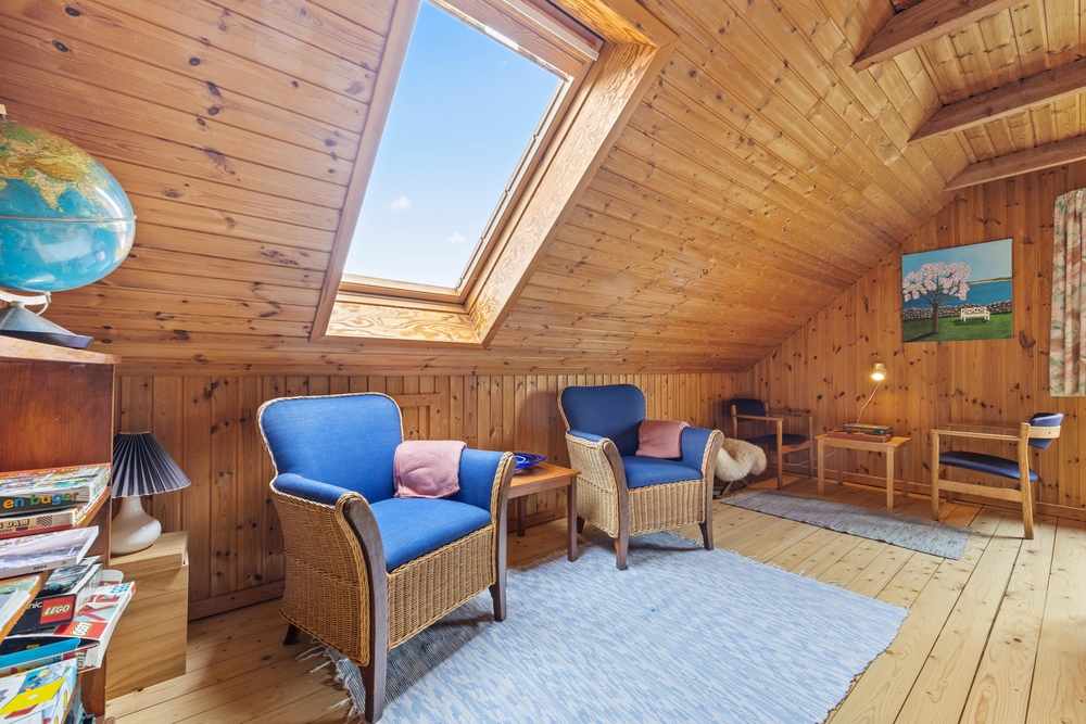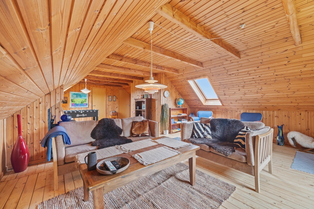 Folgt ihr der Treppe nah oben, gelangt ihr in den charmanten Wohnbereich mit Dachschrägen, alten Dielenböden und gemütlicher Einrichtung. Hier könnt ihr euch auf dem Sofa vor dem Fernseher entspannen, das Knistern des Kaminfeuers genießen oder eine Partie Tischfußball spielen. Das Schlafzimmer mit Doppelbett nebenan bietet einen ruhigen Rückzugsort.