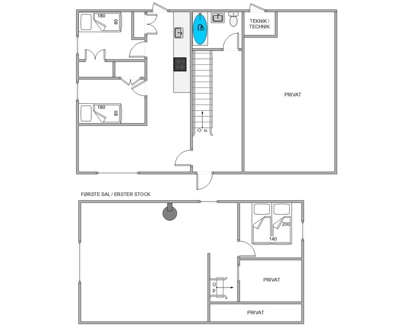 Das einfache Badezimmer ist mit Fußbodenheizung und Badewanne mit Dusche ausgestattet. Im Erdgeschoss gibt es zudem zwei Schlafzimmer mit jeweils einem Einzelbett (80 x 180 cm) ? ideal für eure Kinder.